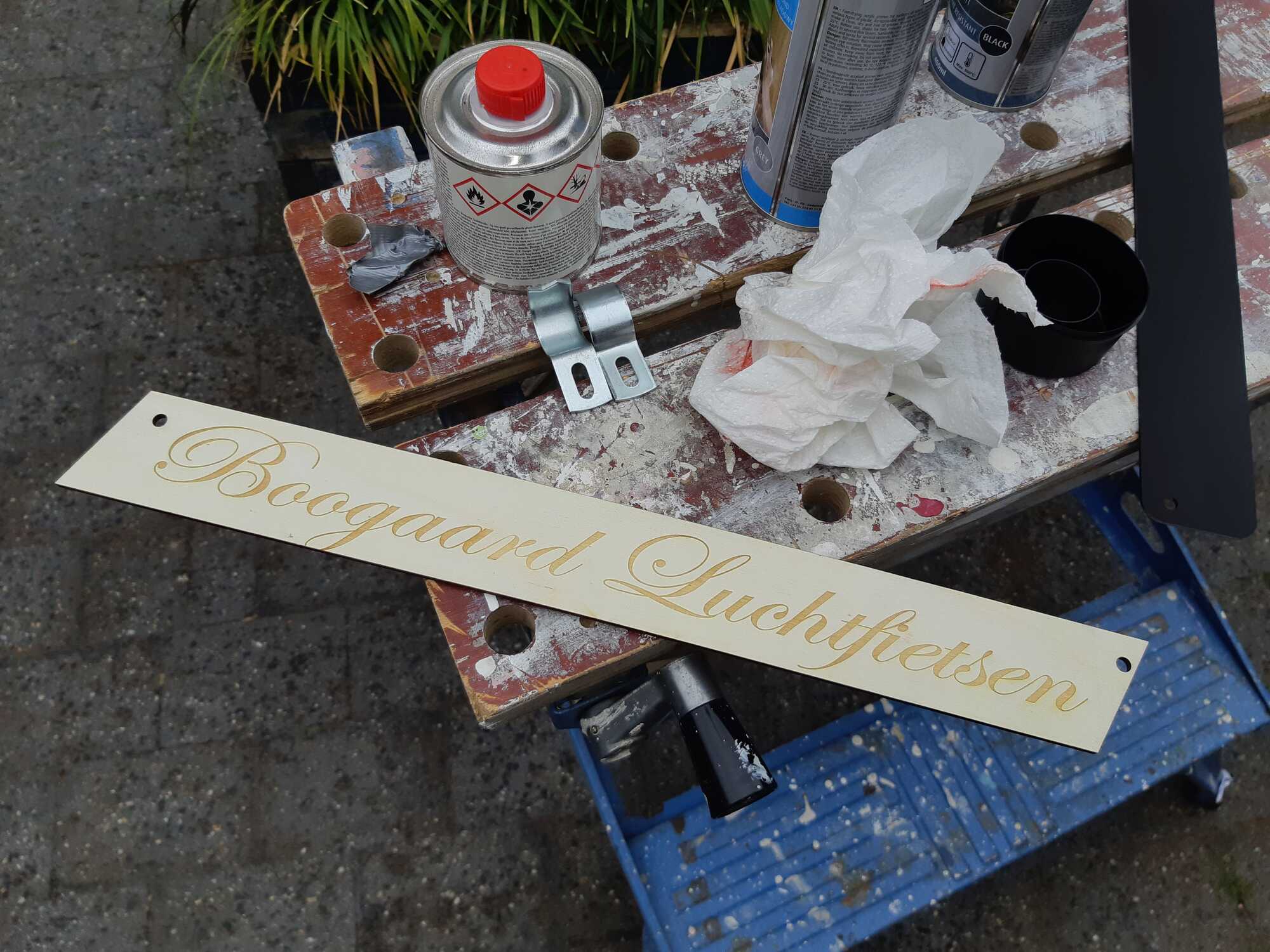 Klaar is het bordje. Ding is van kunststof, kan tegen weer en wind en wie niet beter weet ziet een handgeschilderd bordje met witte letters: