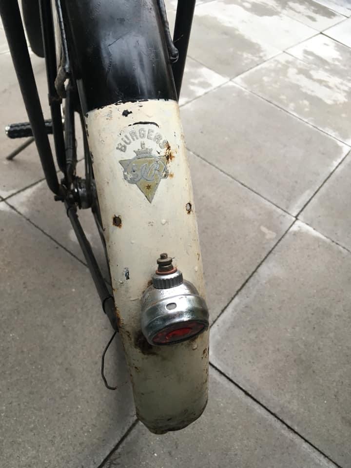 ik denk dat deze fiets niet in de fabriek , maar door een grossier of fietsenmaker na de oorlog is gereviseerd. als hij naar de fabriek was gestuurd zouden er denk ik wel burgers spatborden op gezet zijn. Nu zitten er van die standaard spatborden op die elke grossier of fietsenmaker verkocht.