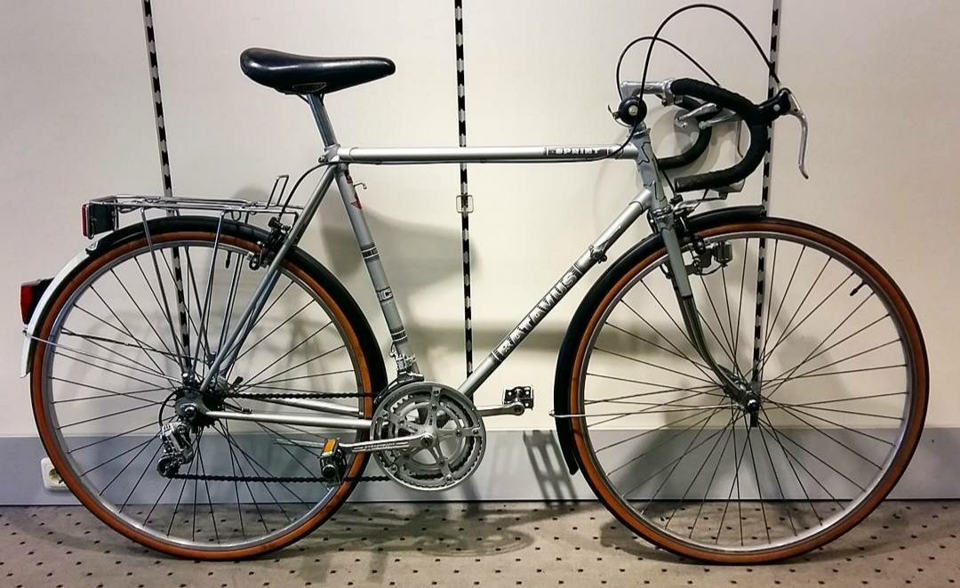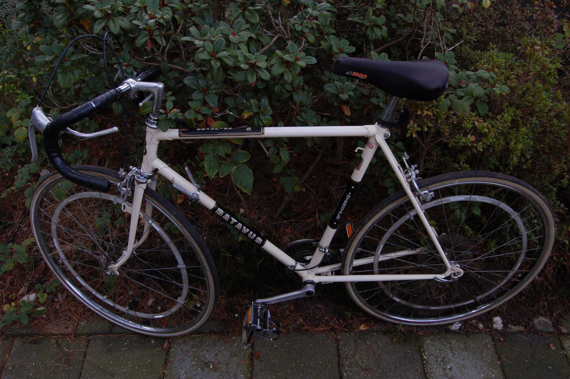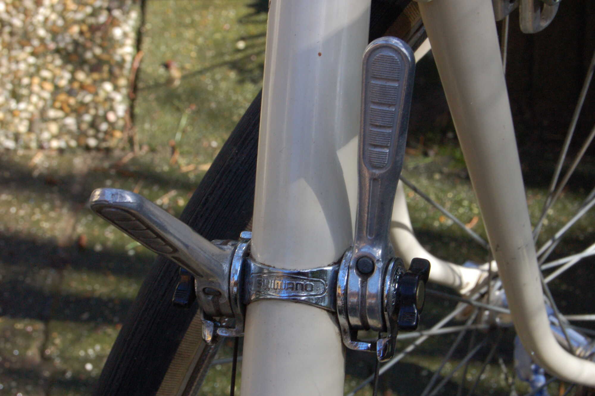 Deze hieronder is van 1980. Decals met strepen, Shimano Altus derailleurs.