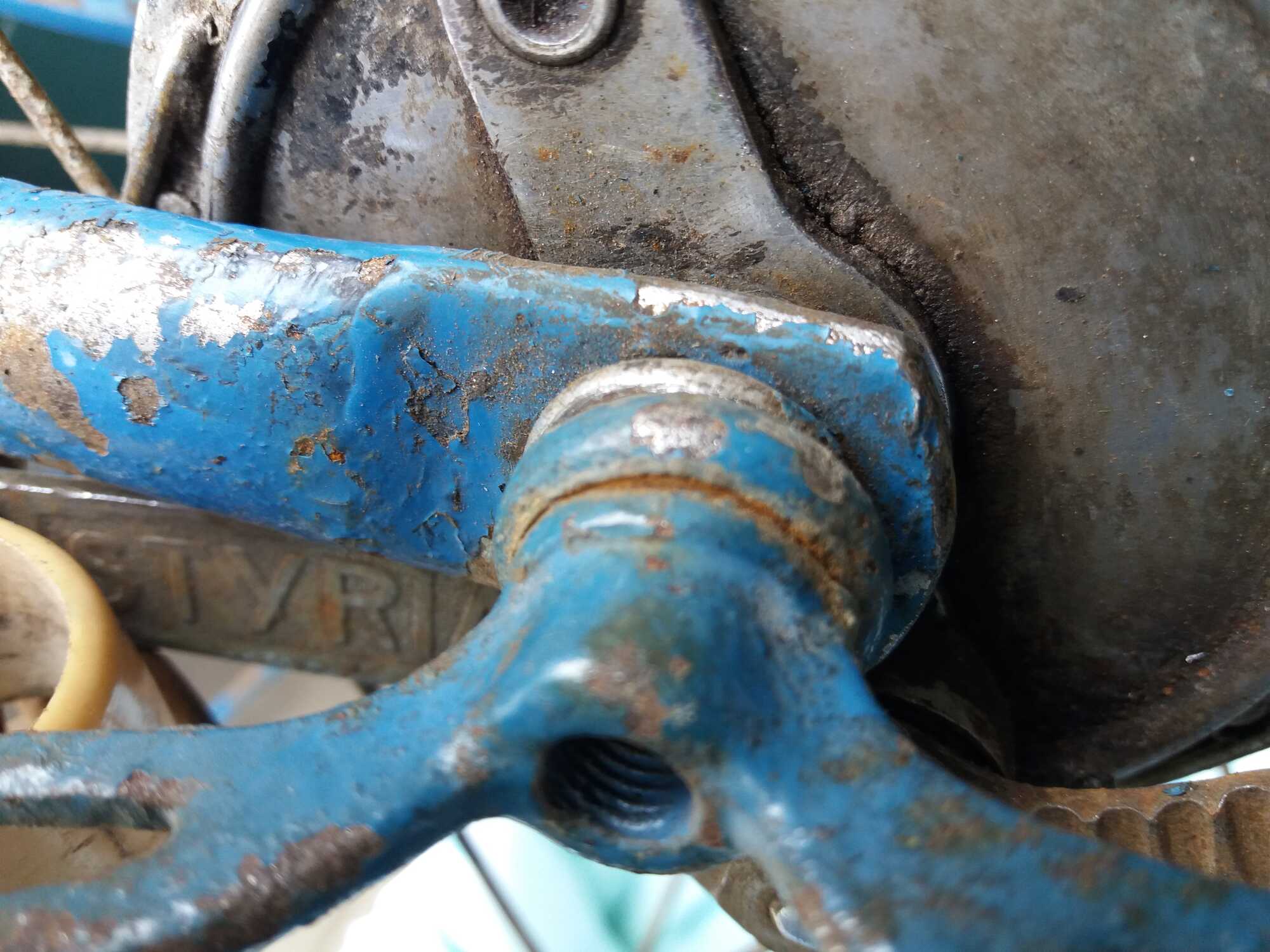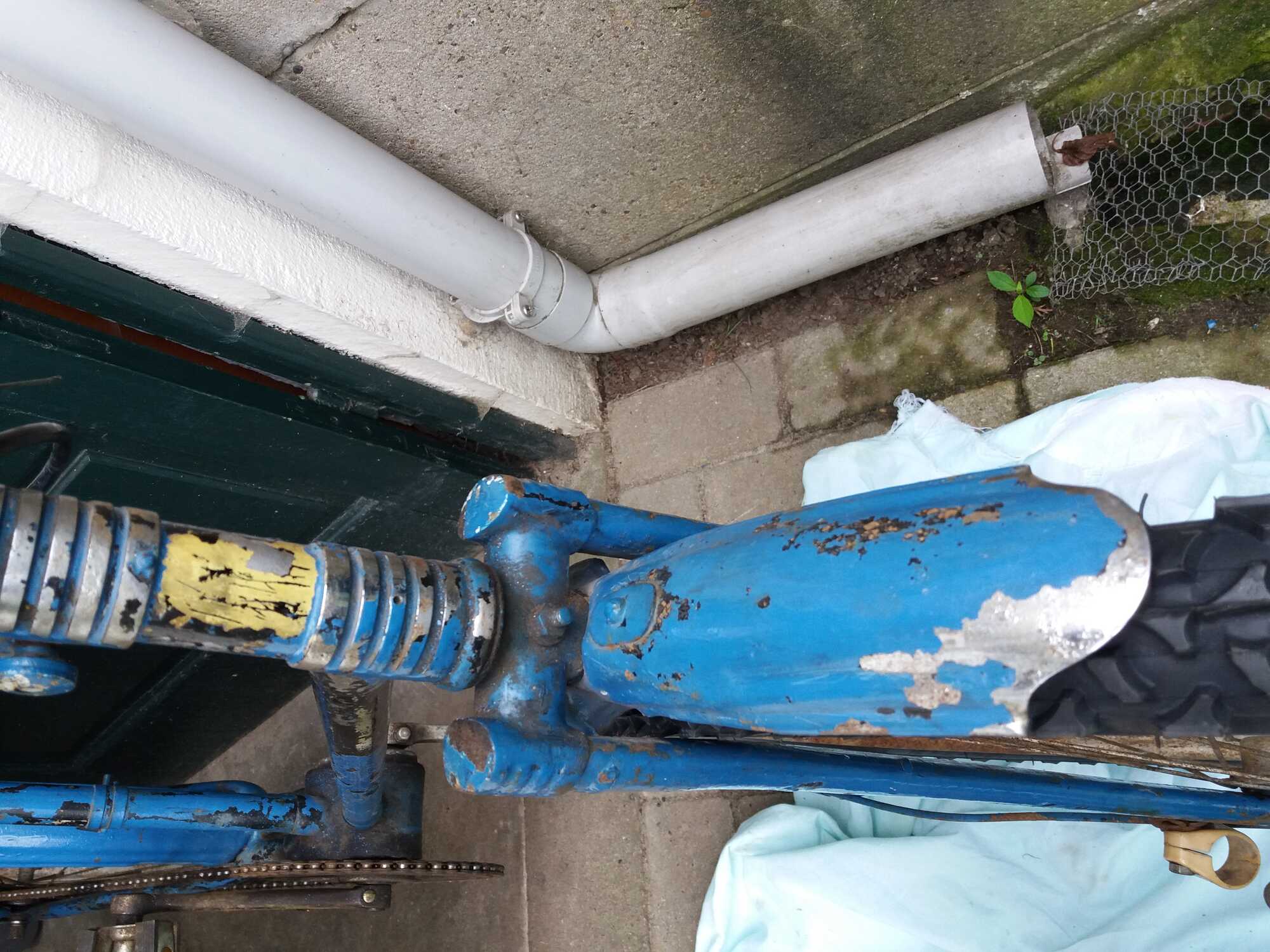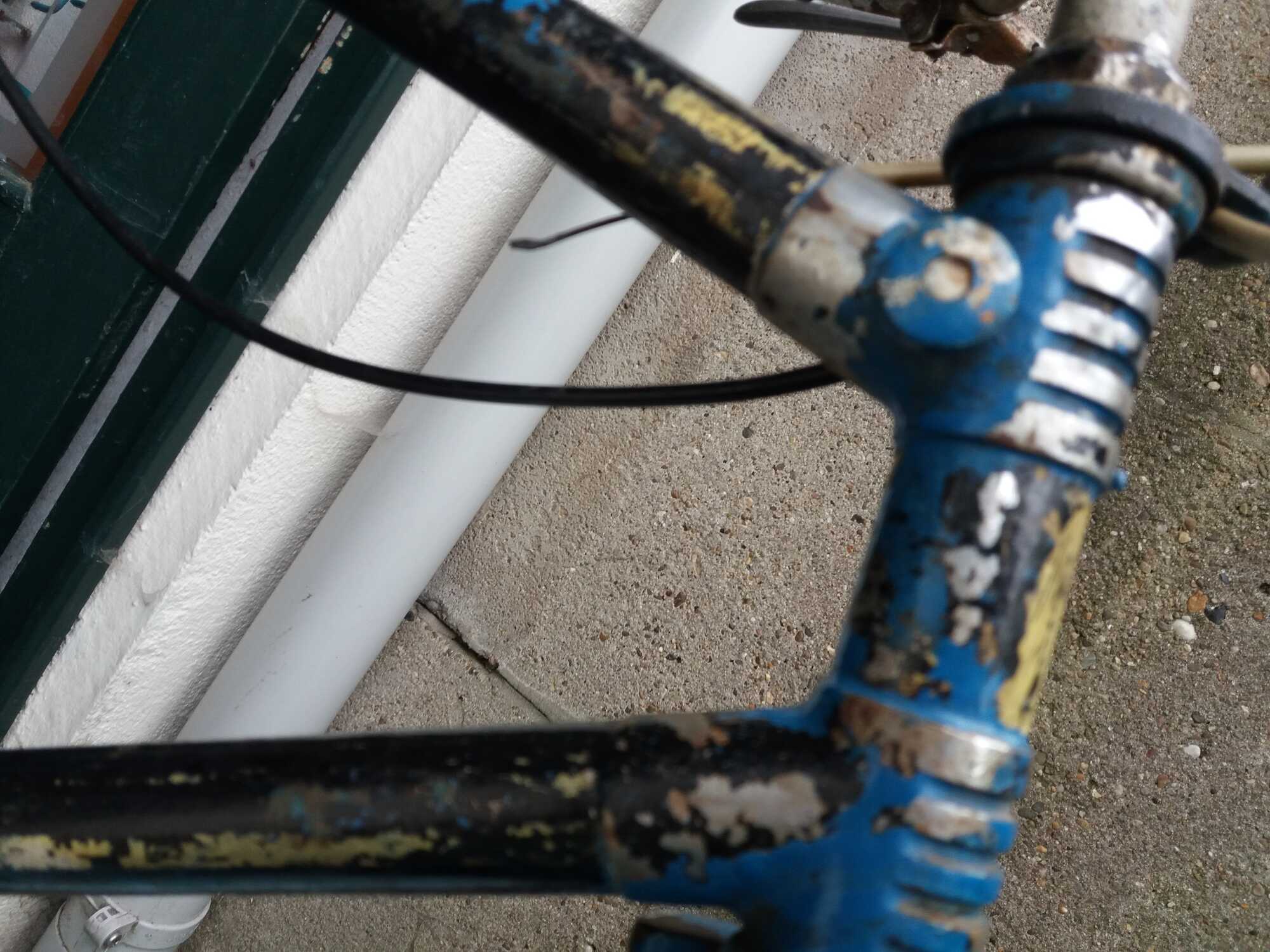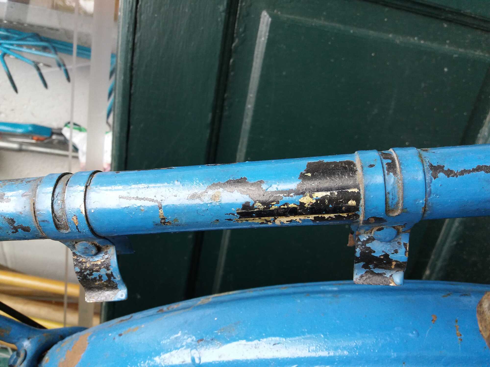 We zien een fiets waarvan de lak op veel plaatsen loslaat hetgeen me voor het 'opknappen' een moeilijk punt lijkt; zo laten of opnieuw lakken, een dilemma.