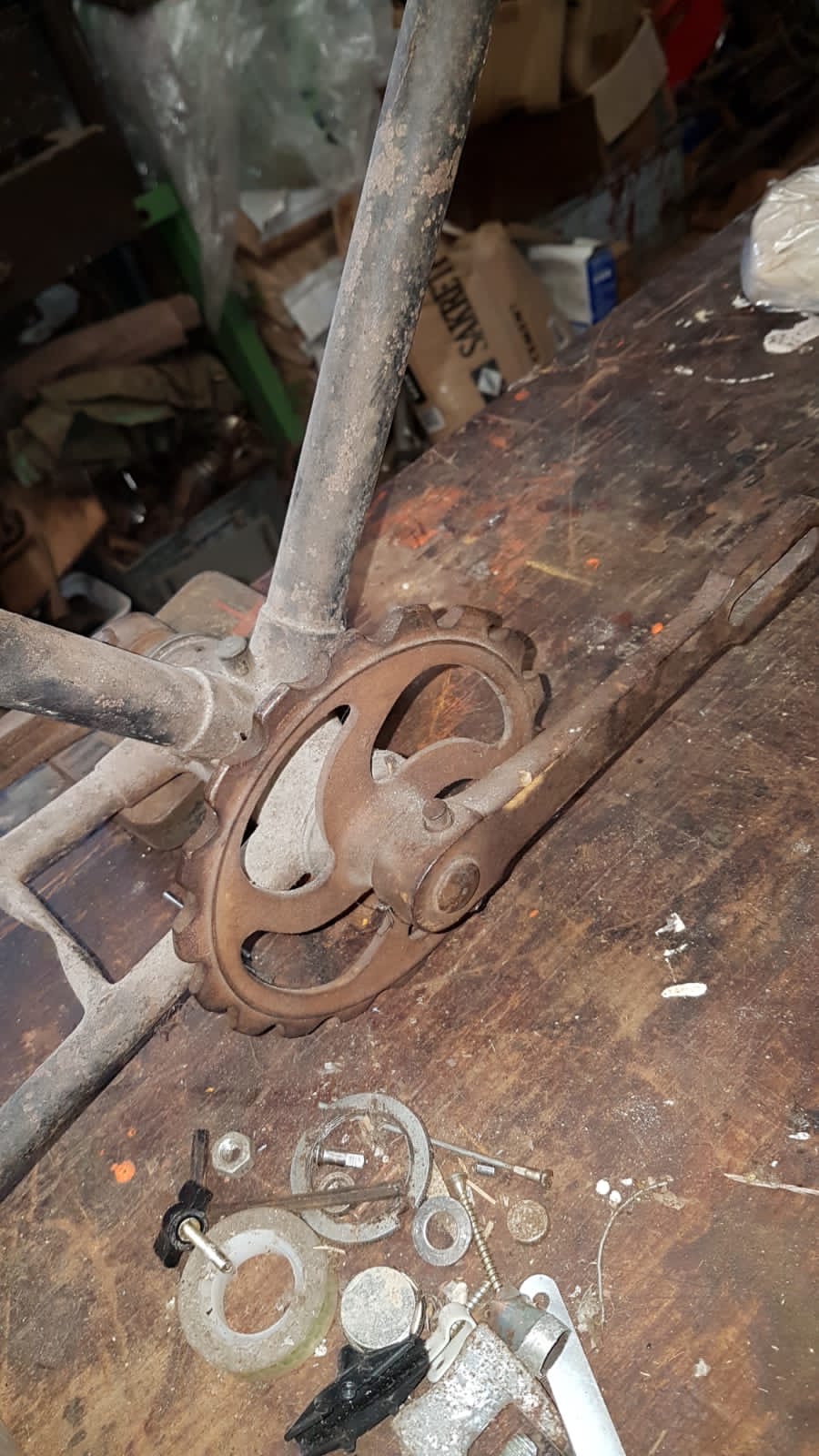 Tandwiel met vier ronde armen linksom lopend (die armen, niet de ketting), balhoofd met vernikkelde lagers en ook de voorvork kroon is vernikkeld.
