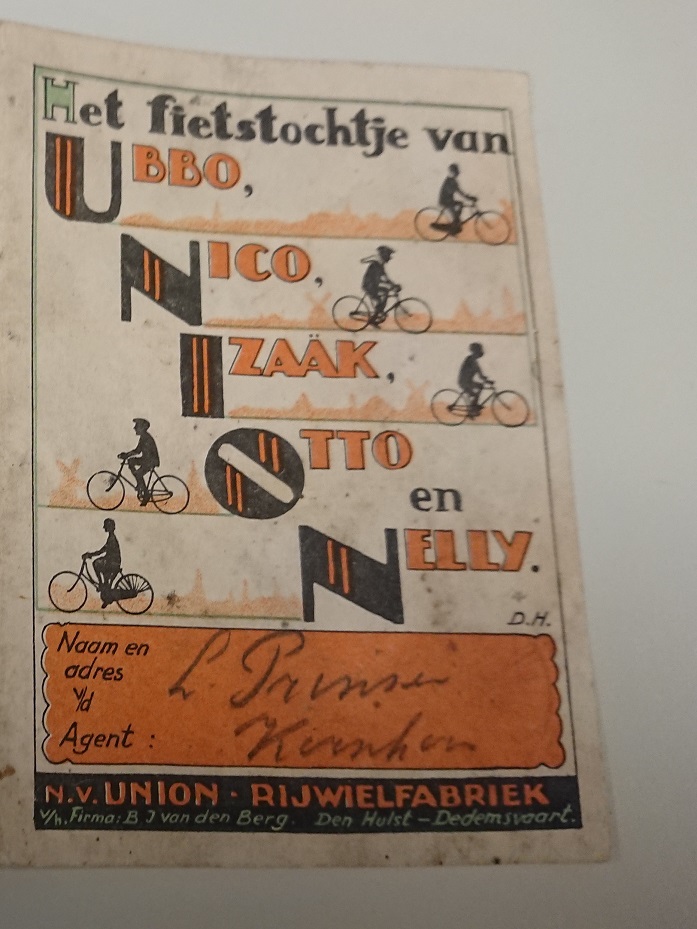 Aan twee zijden bedrukte leporello, met op elke pagina een afbeelding en een vierregelige rijmende tekst, beginnend met een grote letter. Die letters vormen samen de merknaam; Union rijwielen; Het verhaaltje gaat over Ubbo, die een Union fiets heeft, en zijn vrienden en zus, die op merkloze barrels rijden. Daarmee gaat het uiteraard mis. Illustraties met de kleuren groen, oranje, bruin en zwart. Op de voorkant ruimte voor een stempel (?) met; Naam en adres v/d Agent. De bekende Daan Hoeksema is de illustrator van deze leporello uit 1928. De Koninklijke Bibliotheek in Den Haag heeft een exemplaar in bezit dat op afspraak te zien is. Ik ben benieuwd of er onder de leden van de oude fiets nog iemand is die ook in bezit is van deze uitvoering.