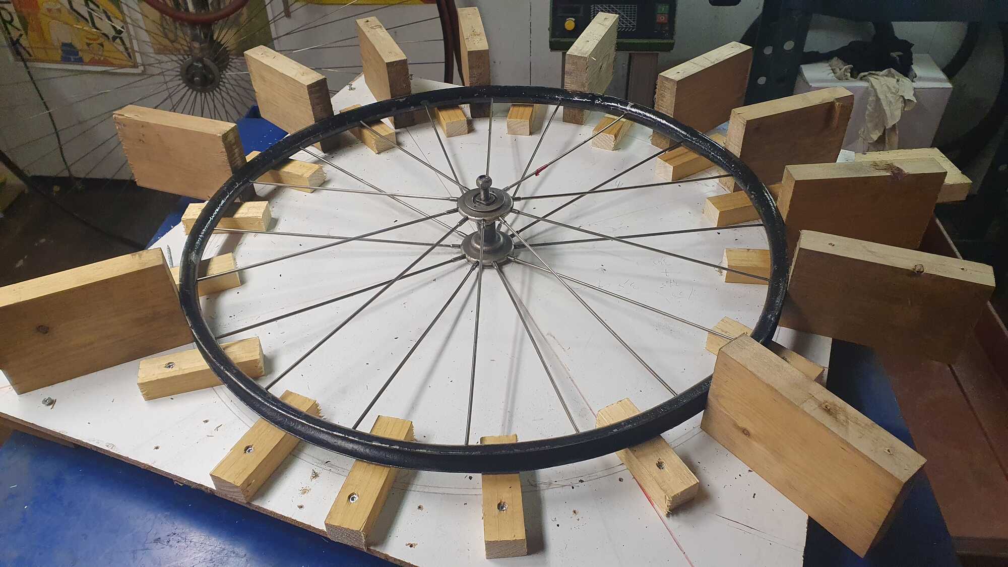 Na de voltooiing van de wielen, kon de voorvork met de lagers bevestigd worden op het voorwiel.