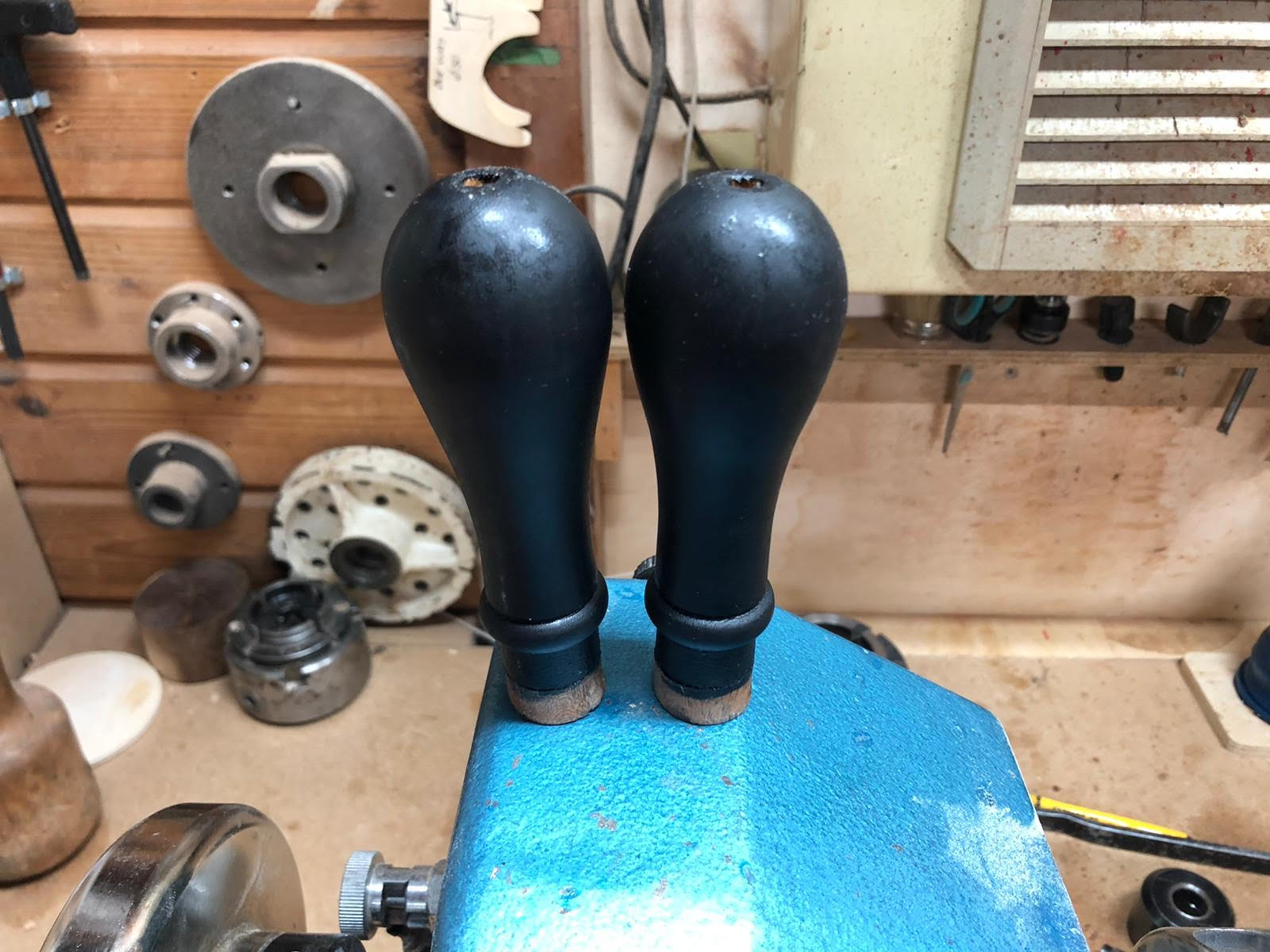 Bij een gespecialiseerde bevriende houtdraaier, heb ik twee handvaten laten draaien naar het originele model.