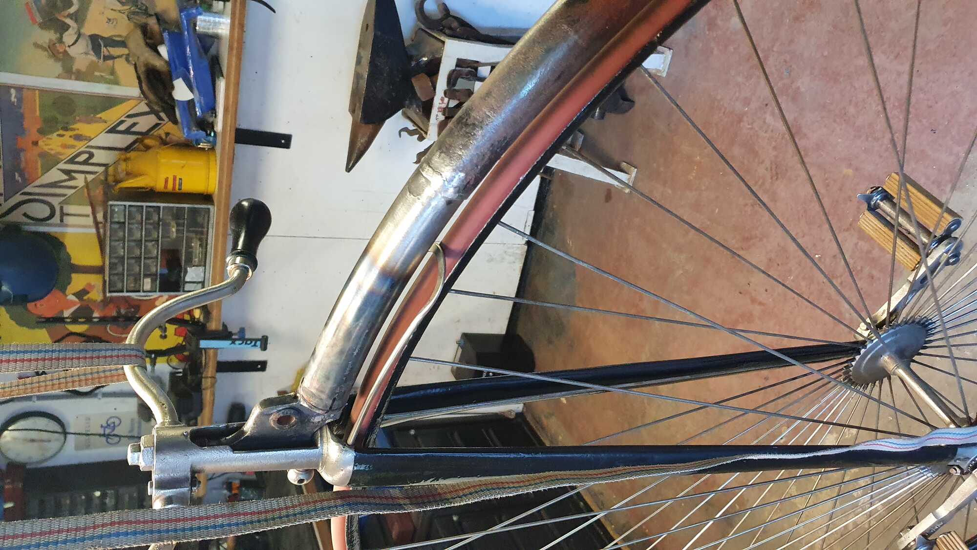 Het neusstuk is netjes hard-gesoldeerd aan de nieuwe pijp. Tussen beide pijpdelen is een tussen-bus geplaatst om meer stevigheid te bieden met het aflassen. Op de foto staat de voorvork iets te veel naar voren gebogen, dit is omdat het neusstuk toen nog niet was vast gesoldeerd.