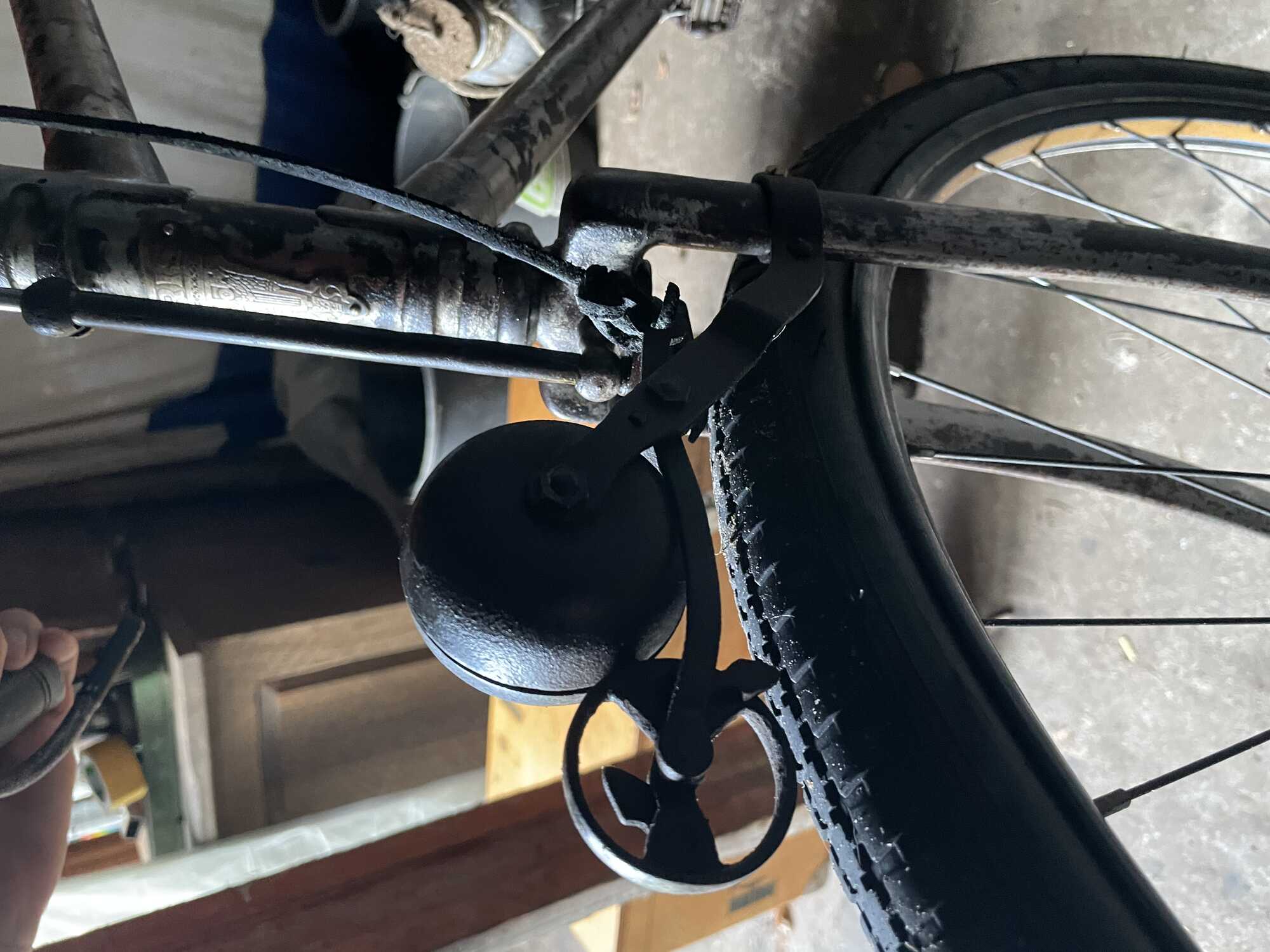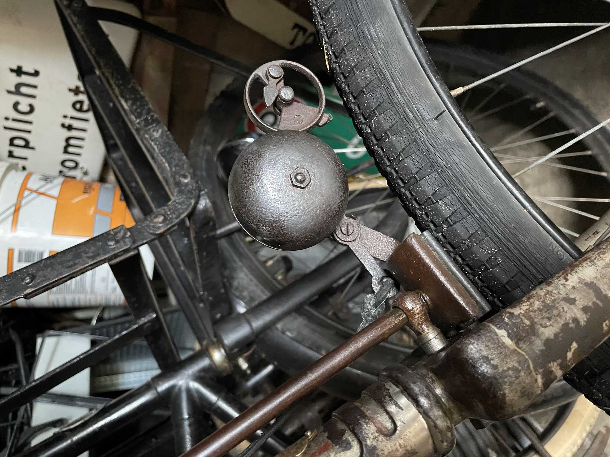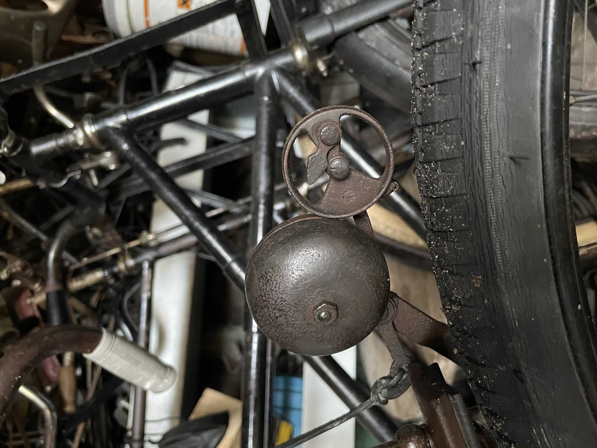 Ik ben geintrigeerd door wat er voor de voorvorkkroon zit. Is het een 'Sturmschelle', een bel op het loopvlak (waarmee je enorm veel herrie kunt maken) zoals ik denk? Ze worden nog steeds gemaakt; ik heb er eentje uit Duitsland laten komen, maar gebruik hem niet. [bijlage]