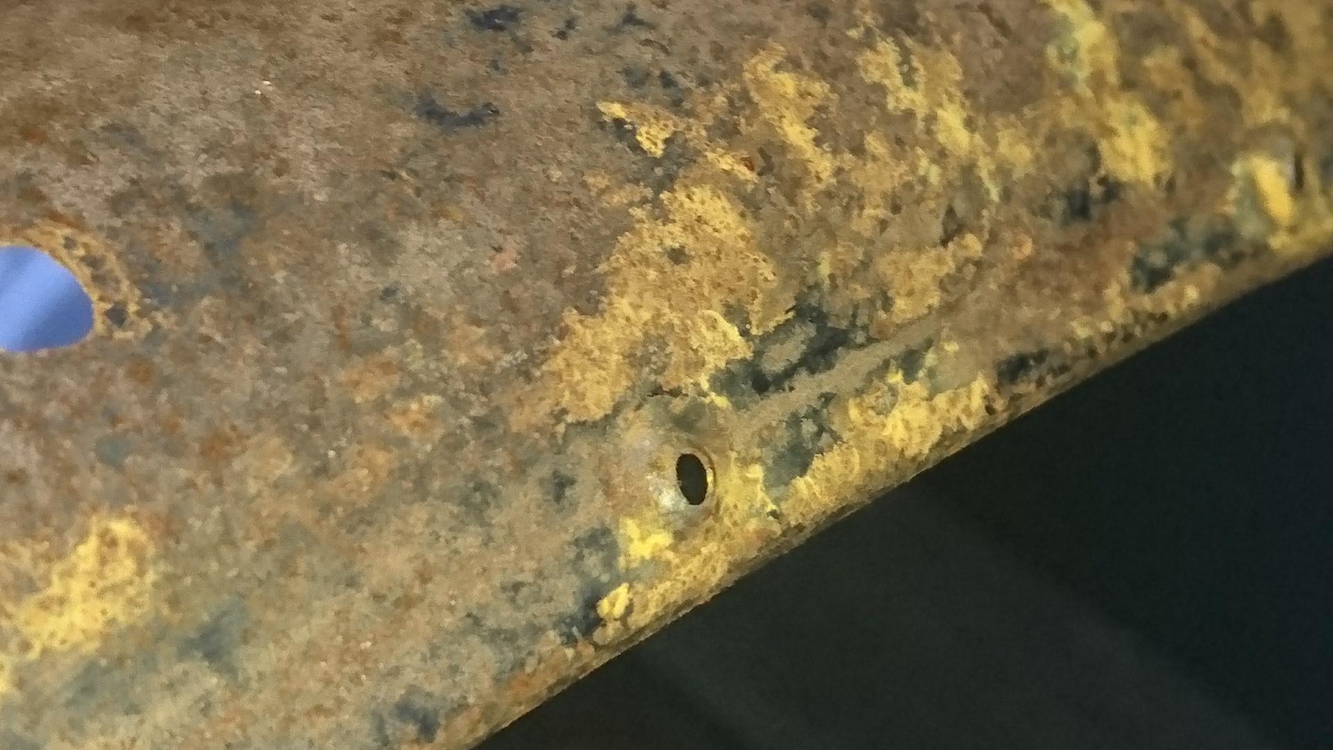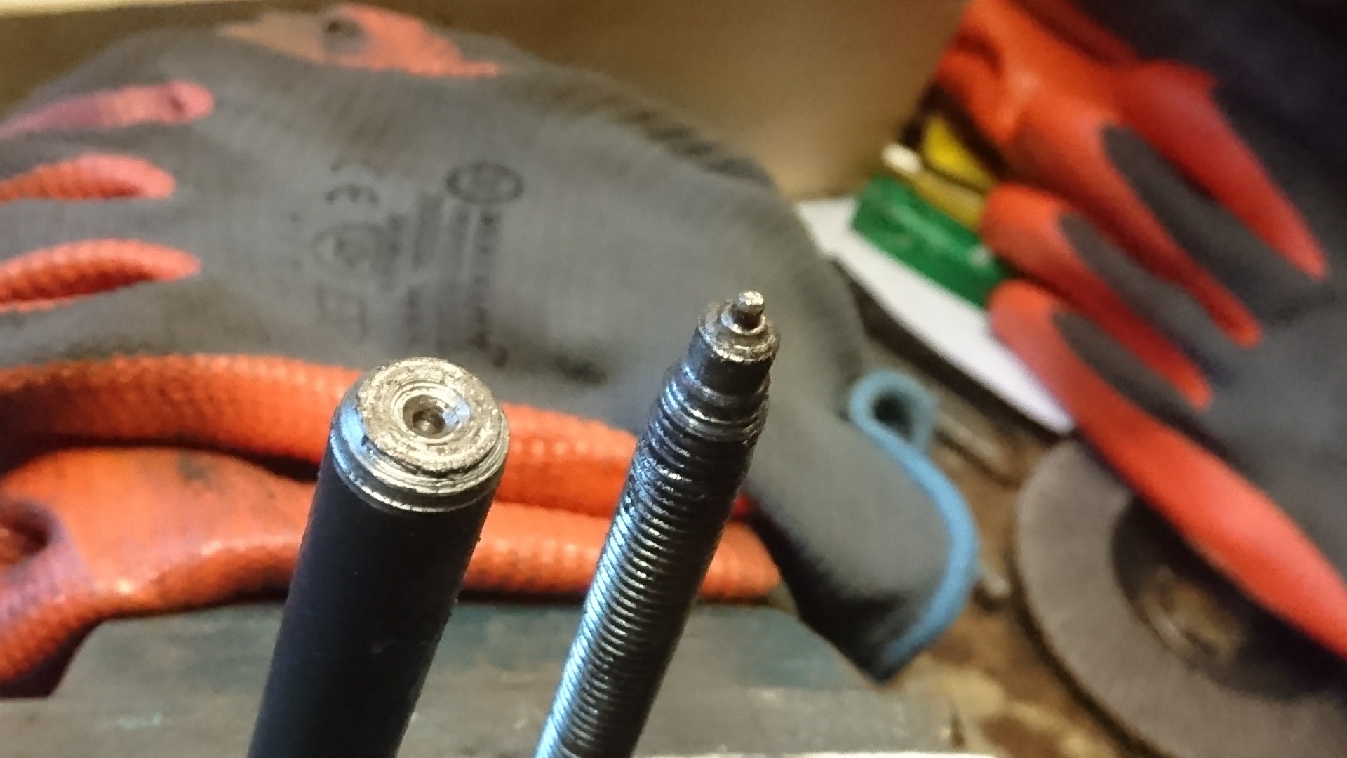 Bij deze. Van een tapeindje heb ik de 'bolle' kant gemaakt. Die vast in de bakschroef gezet. De 2,5 mm gaten voorgeboord. Vervolgens de holle kant met een ferme mep erop en klaar is Maarten! Ging prima. Het is allemaal een beetje ruw wegens de roestige spatborden - die echter perfect bij de fiets passen.