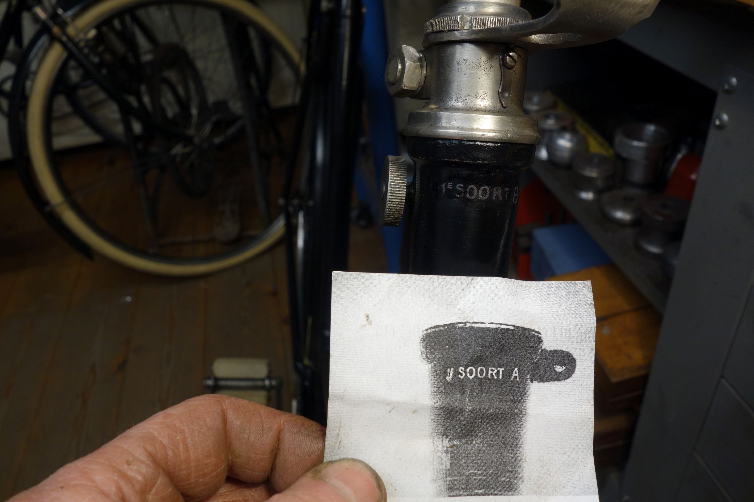 Ik heb in dit geval er ook een geleider bij gezet. Je kan zodoende de resten stuurbuis uitboren zonder de boel te mollen. De fiets heeft inmiddels banden en lak en biezen en zelfs een code op de bovenste balhoofdlug: 1 e Soort B. Ik heb het gecopieerd van een foto van de beeldbank. Mogelijk ga ik de OO `s nog wat dunner schuren maar als impressionistisch werkje vind ik het al heel aardig. Het waren witte wrijfletters die ik wat verziekt heb met leer indringverf. De biezen trouwens ook. Ze waren aanvankelijk veel te fel en fris. Nu ben ik toe aan de kettingkast (met raampje) en jasbeschermers.