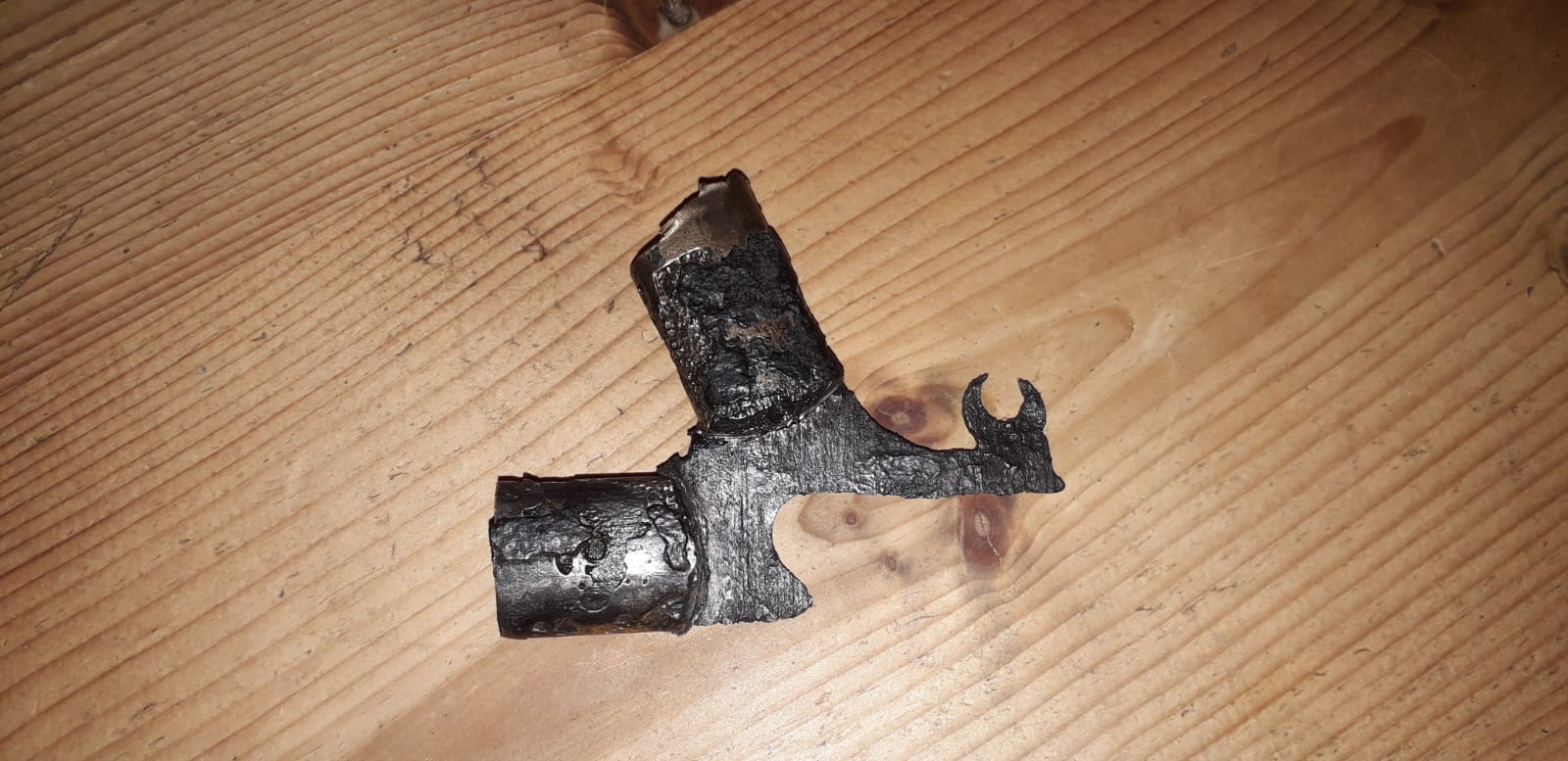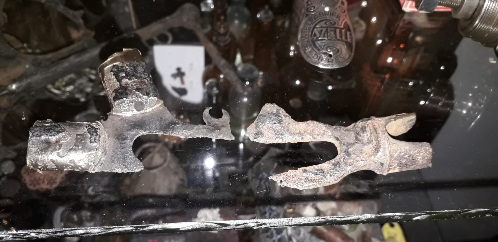 ook zit er een gaatje in alsof er een draadje naar boven heeft gelopen (naar het zadel)