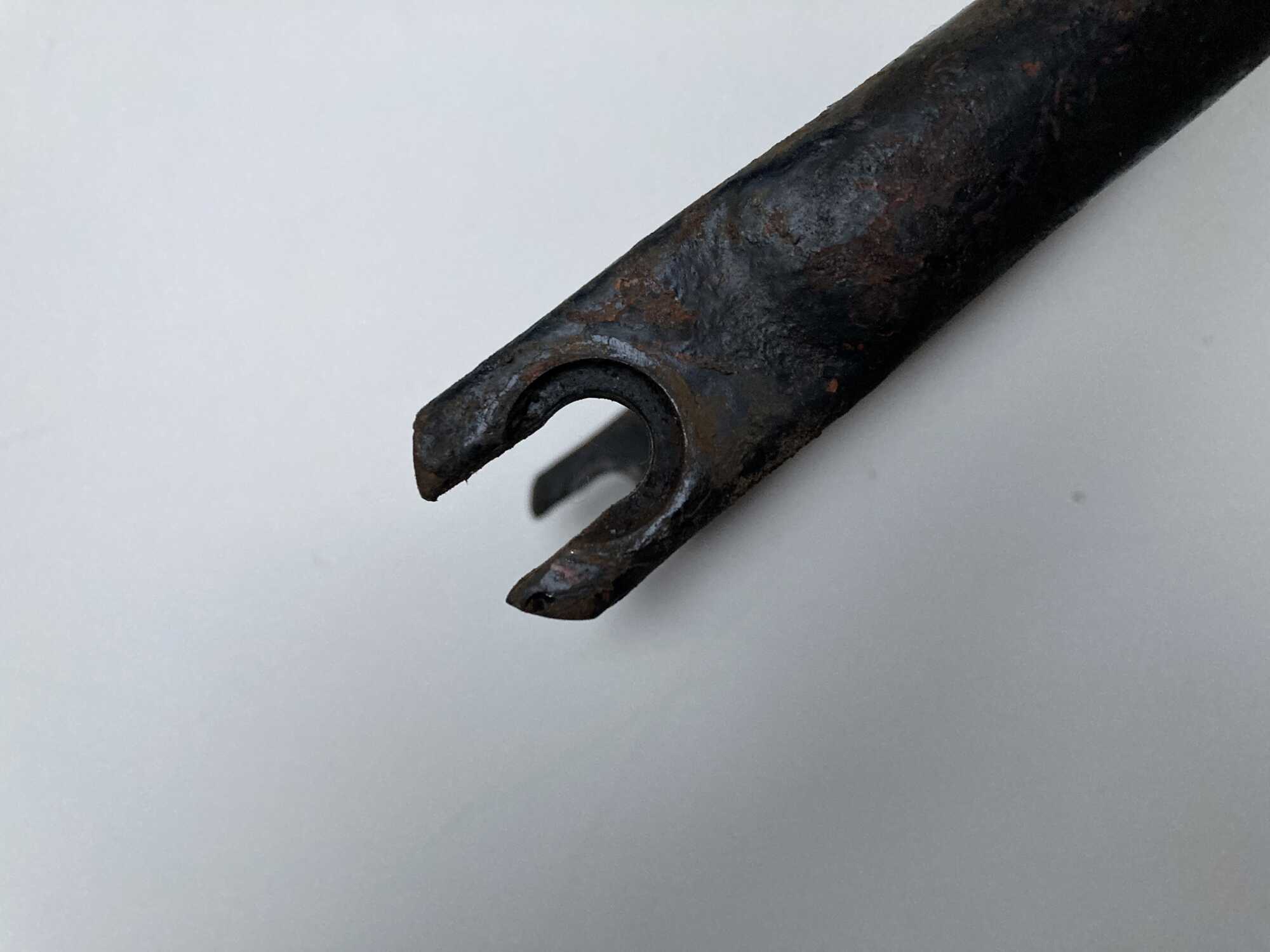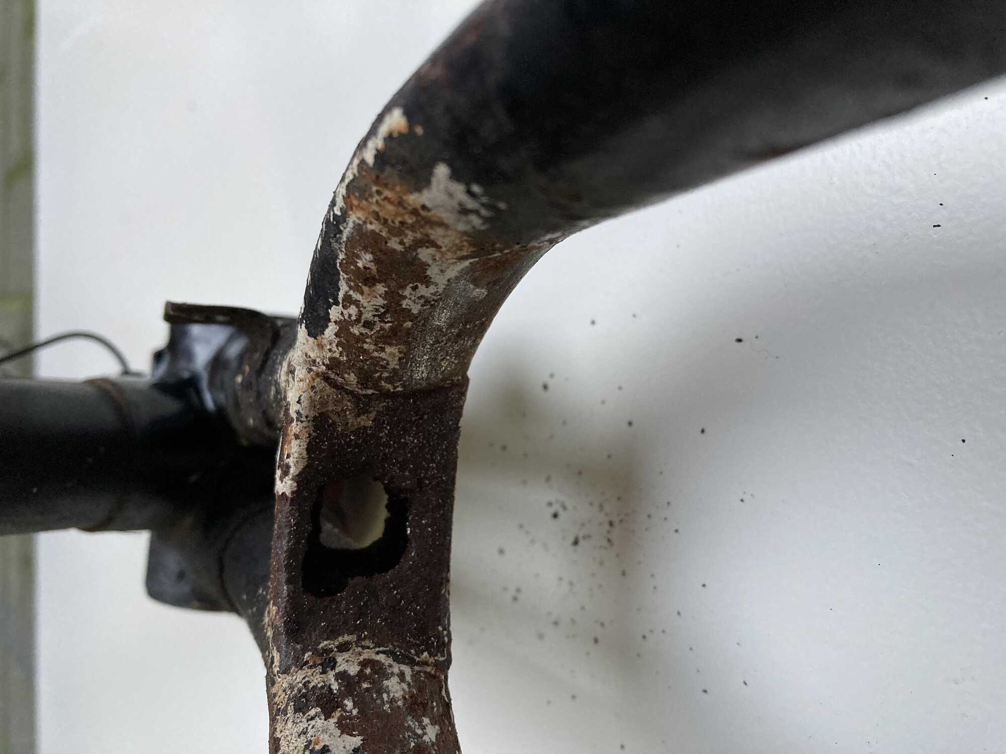 - In de liggende achtervork is het middelste gedeelte t.p.v. het boutgat voor het achterspatbord ver weggeroest. Hier moet sowieso iets aan gedaan worden; roest stoppen en gat vullen met…?