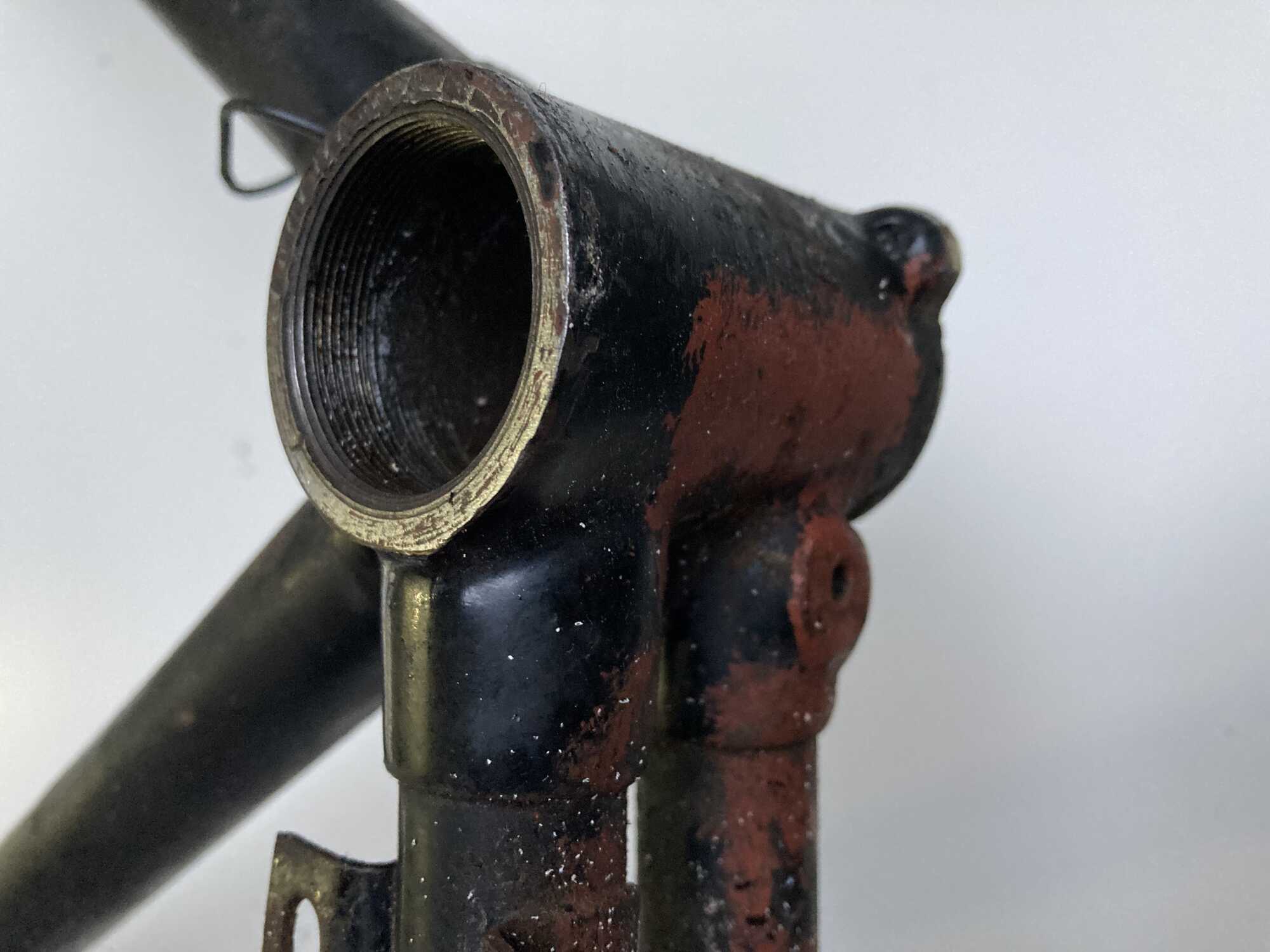 Herstellen naar origineel met alles erop en eraan lijkt mij voor deze fiets een hele lange weg, ook omdat ik dit nog nooit eerder heb gedaan. Een mooi alternatief voor het frame vind ik een pathracer, hier is immers niet veel voor nodig. Ik heb de fiets nu helemaal uit elkaar liggen incl. trapas en balhoofd en wil nu eerst gaan kijken of de basis (frame, vork, trapas en balhoofd) o.k. zijn om verder op te gaan bouwen.
