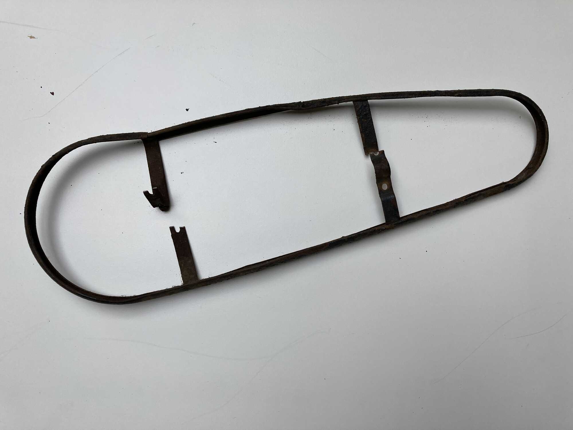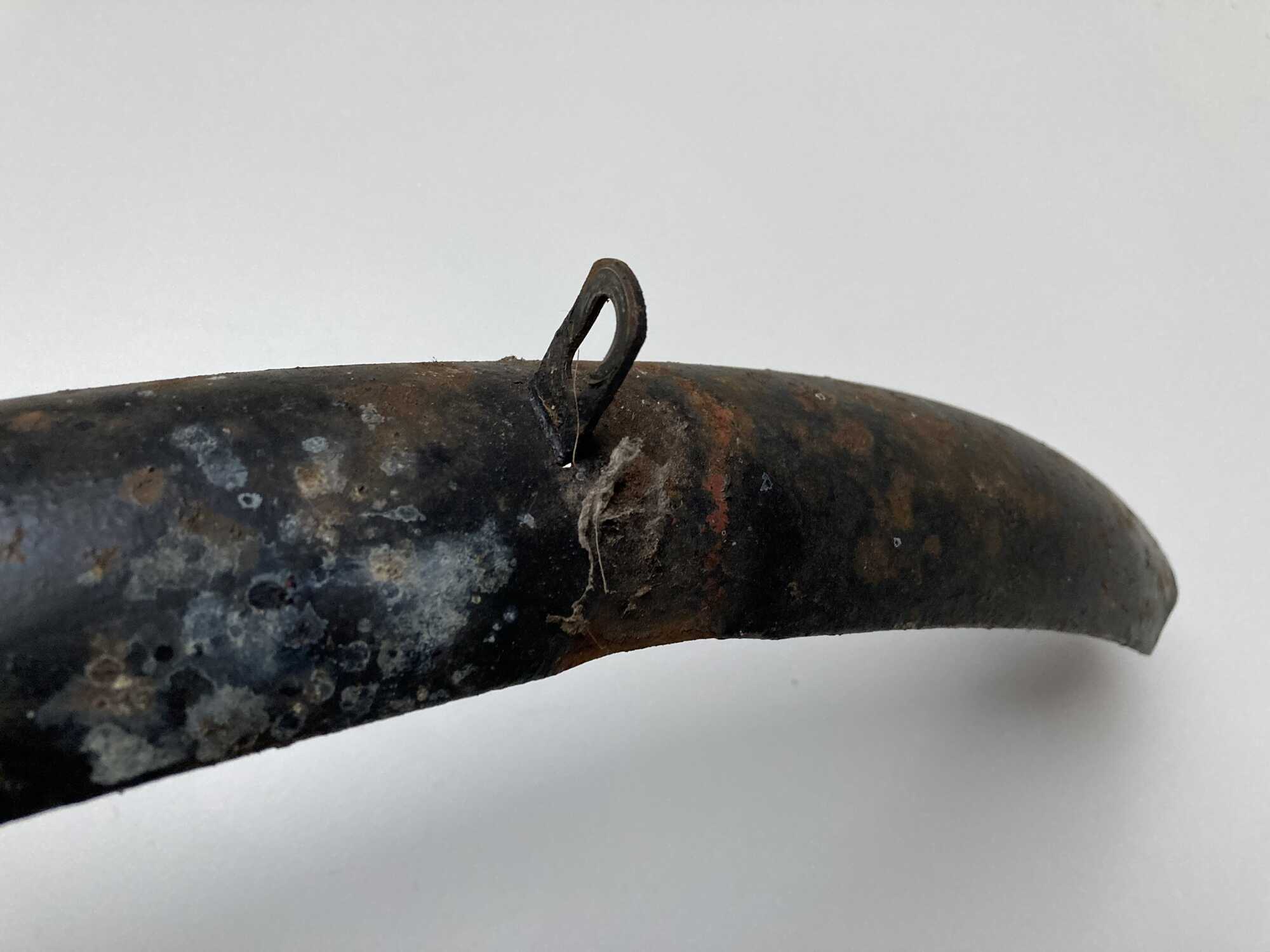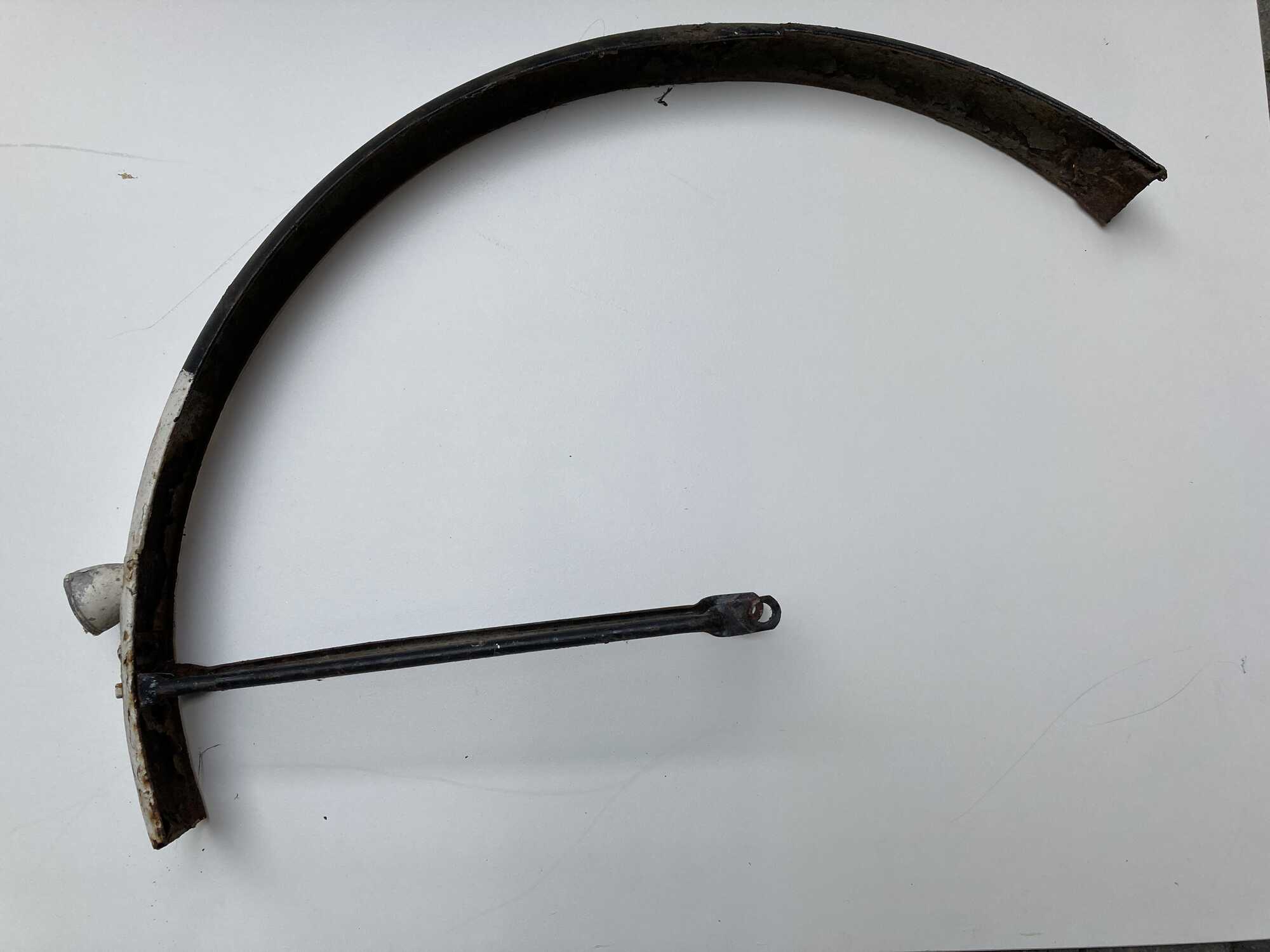 - Het voorspatbord is heel, wel wat schade en roest aan de uiteinden. Een geoefend hersteller zou hier waarschijnlijk nog wel wat mee kunnen. Spatbord is ca. 62 mm breed en volledig rond zonder profilering.