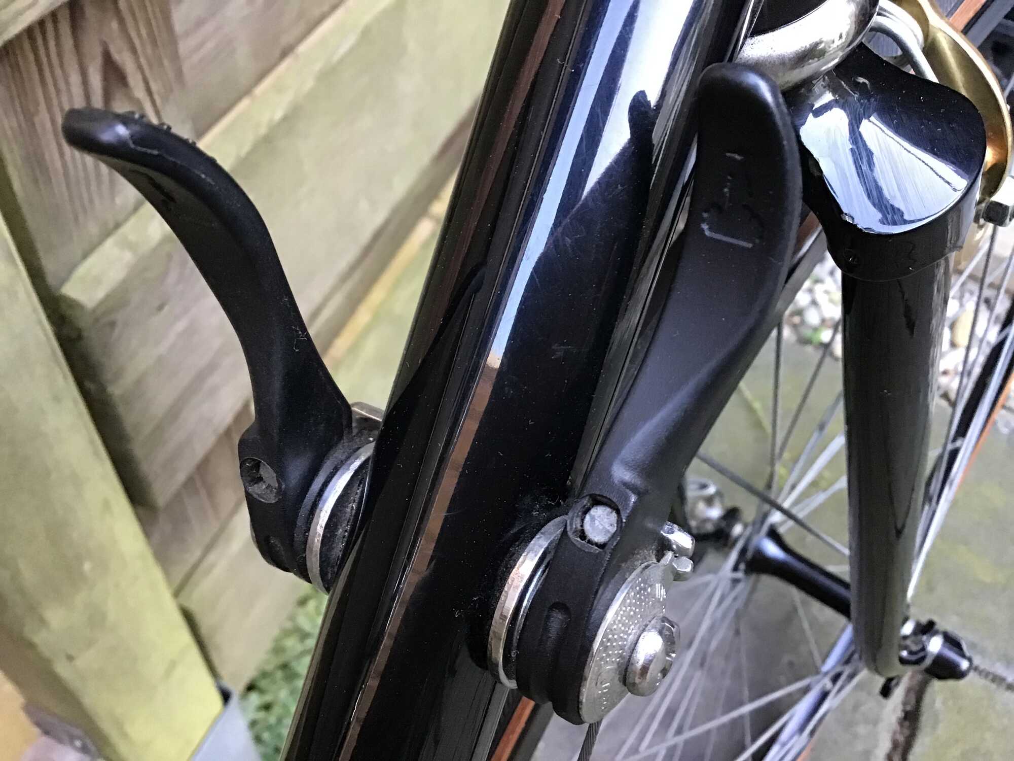 De mijne is zo weinig gebruikt dat de lak nog niet van de remvlakken is afgesleten.
