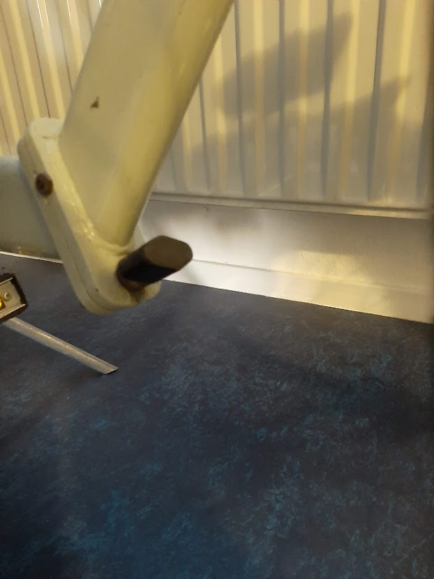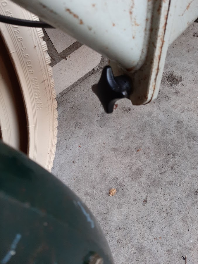 De onderste (zichtbare) blokkeerschroef is gemodificeerd met een paar M10 moeren. ik ben op zoek naar een goed voorbeeld van het origineel. Maar er lijken twee varianten. Ik zie op foto's hier en daar de kunststof greep zoals die ook op zadel en stuur zitten maar ook zie ik een versie met een langer metalen uiteinde. Waarbij dan de vraag is hoe je die los en vast zou draaien. Wat ook een mogelijkheid is, dat de versie waar we alleen het metaal zien dezelfde is dat die met kunststof greep maar dat het kunststof geheel afgebroken is. (De)montage zou dan met een waterpomptang ofzo moeten.