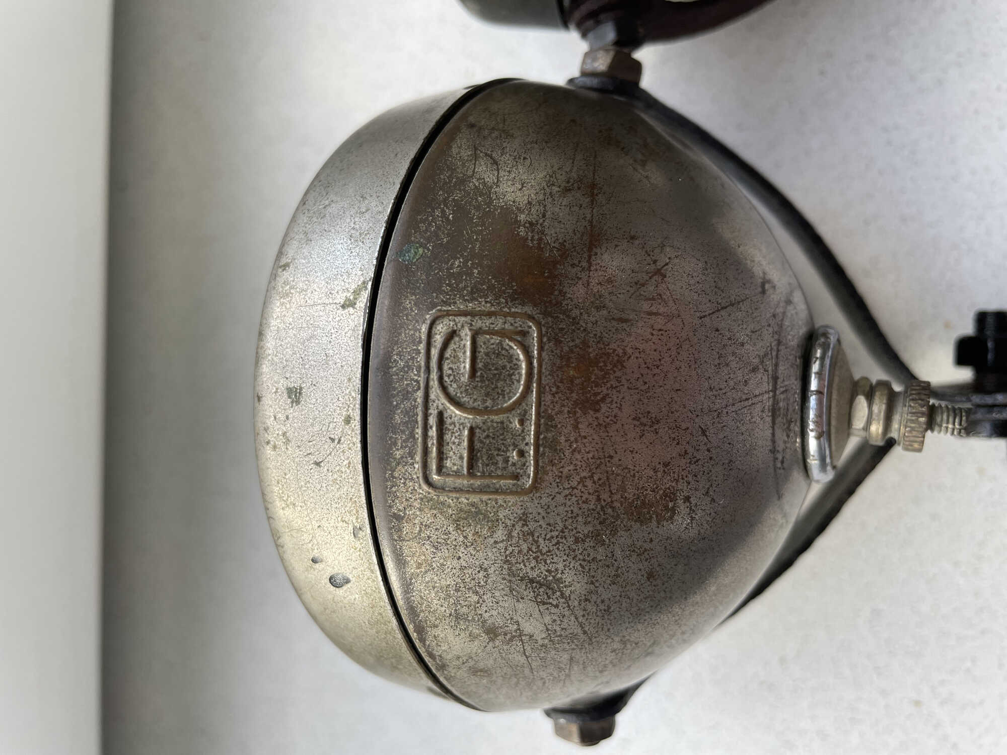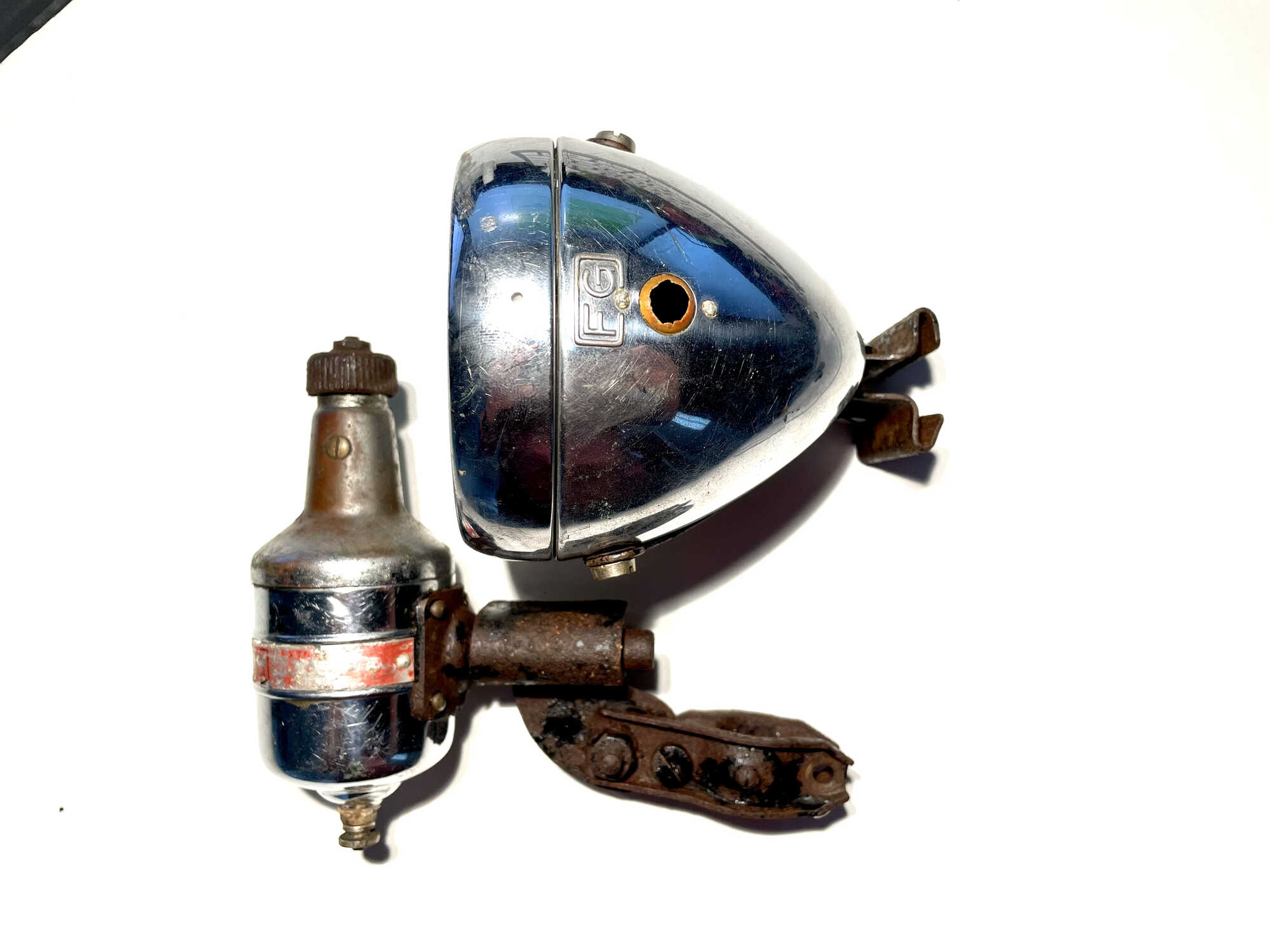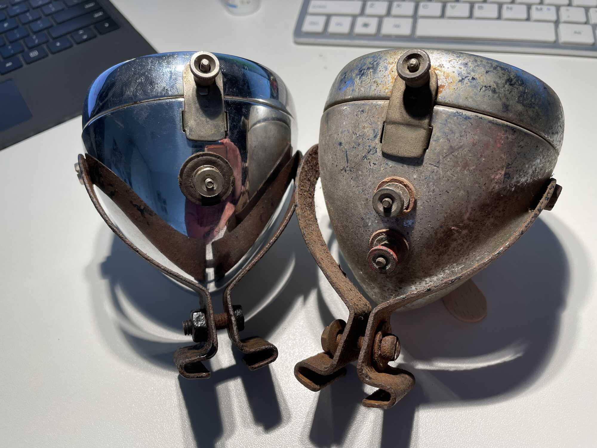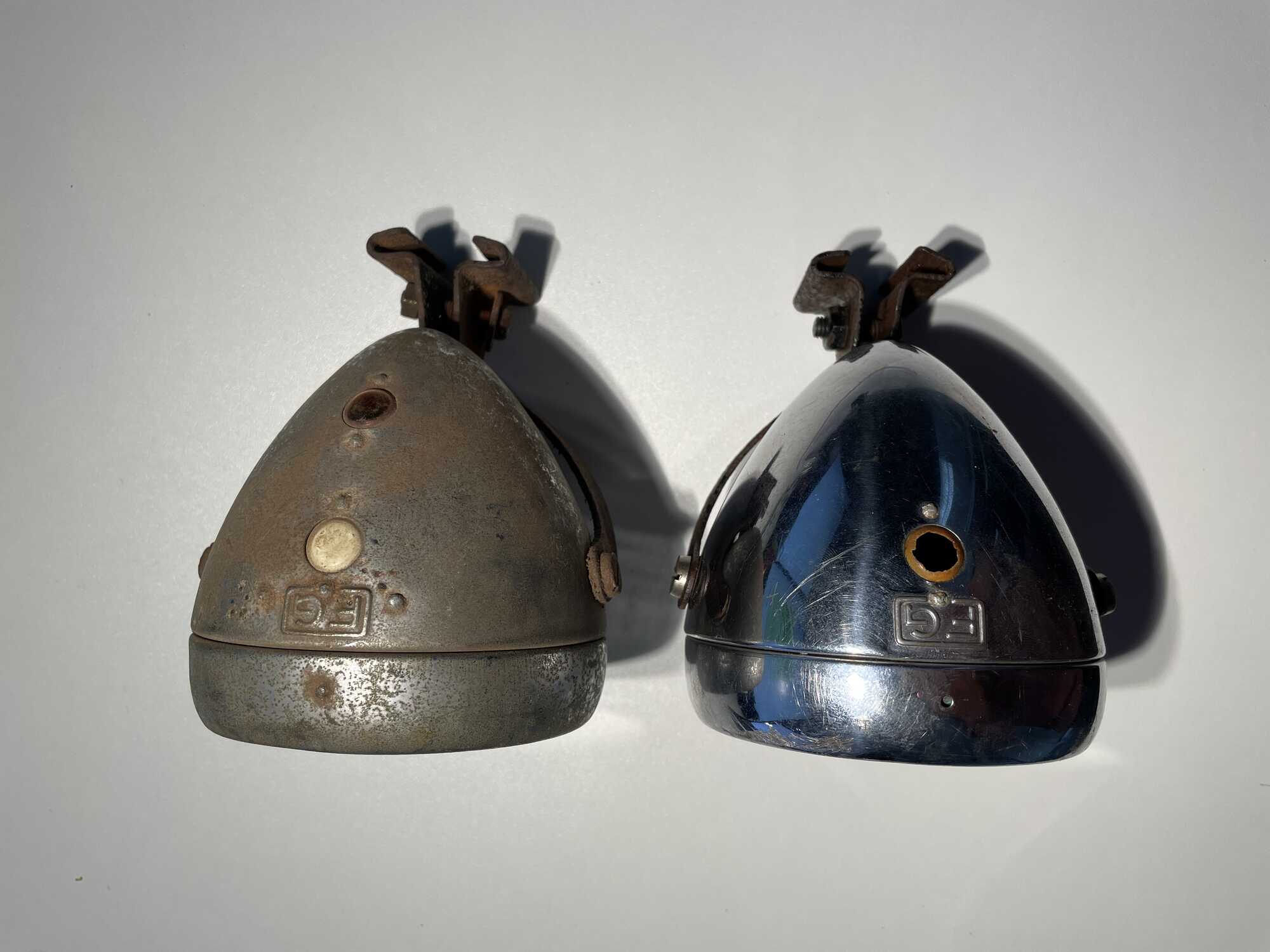 Op deze koplamp zit nog wel iets van nikkel. Op de andere was dat volledig verdwenen. Ook deze heeft een nieuwerwetse beugel.