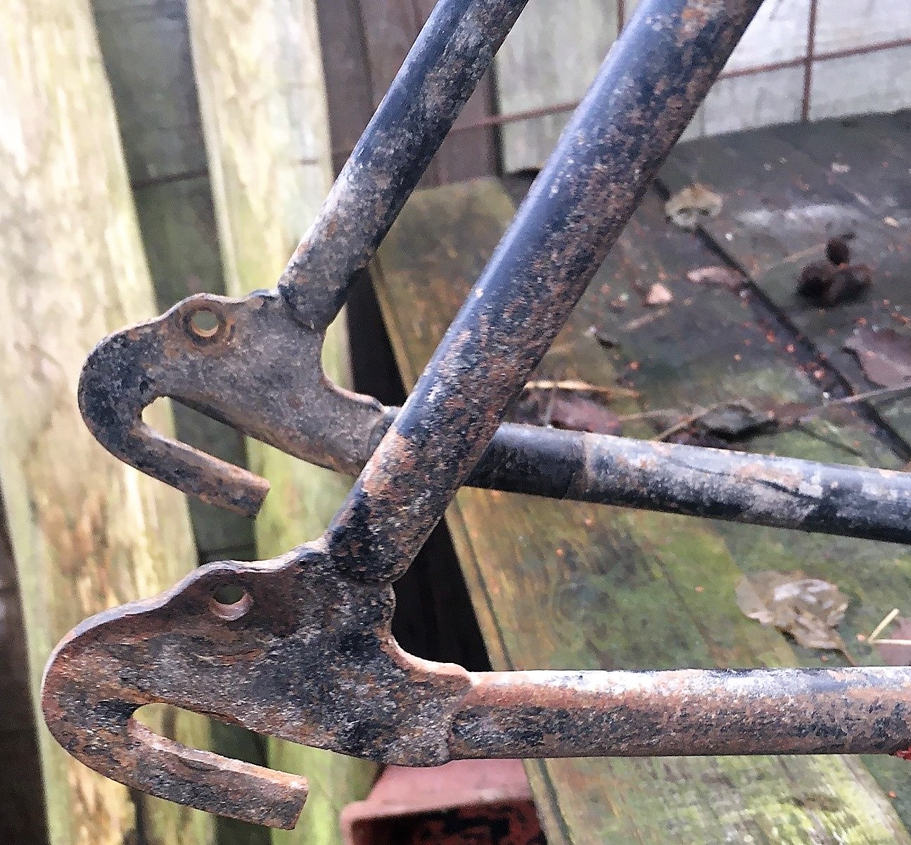 zoals beloofd enkele foto's van het frame. Ik vermoed dat ik intussen tussen mijn oude rommel de voorvork heb gevonden die erbij hoort (zit er los in, lijkt qua lengte te kloppen, en is eveneens Frans)(zadelbuis is niet correct). In de mannetjes tussen de achtervorken zitten geen gaten maar merkwaardig genoeg in de achterste patten wel, en in de vork ook... Er staat ook nergens enige referentie op het frame... Ik heb redelijk wat oud (vernikkeld) materiaal liggen en zou de fiets afmonteren met omdraaiachterwiel, houten velgen, en een Bowden knijprem vooraan. Zadel en racestuur heb ik ook nog wel ergens liggen. De vorkkroon lijkt me wel nogal breed voor een sportfiets