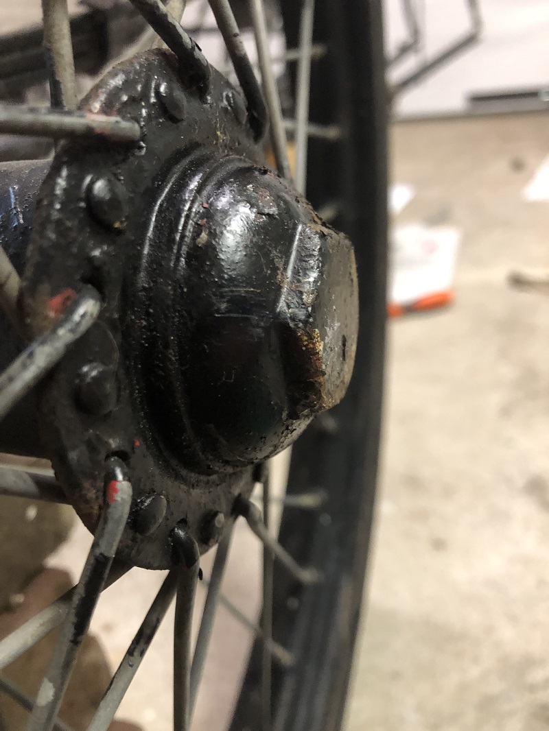 inderdaad gewone rechtse draad en best met een passende dopsleutel (of een pijpsleutel) losdraaien. Mssc eerst met een mesje de blijkbaar nogal dikke verfverbinding tussen dop en naaf doorsnijden of wegkrabben...