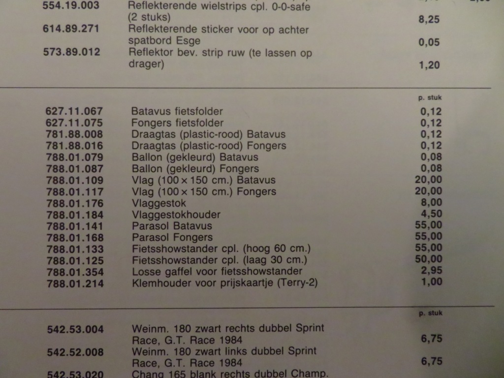 Laatst op de kop getikt: Batavus Grossierderij. Oftewel, catalogus vol met fietsonderdelen die door de fietsenmaker los bij Batavus besteld konden worden. Van derailleurs tot Batavus ballonnen :D Datering: september 1985.