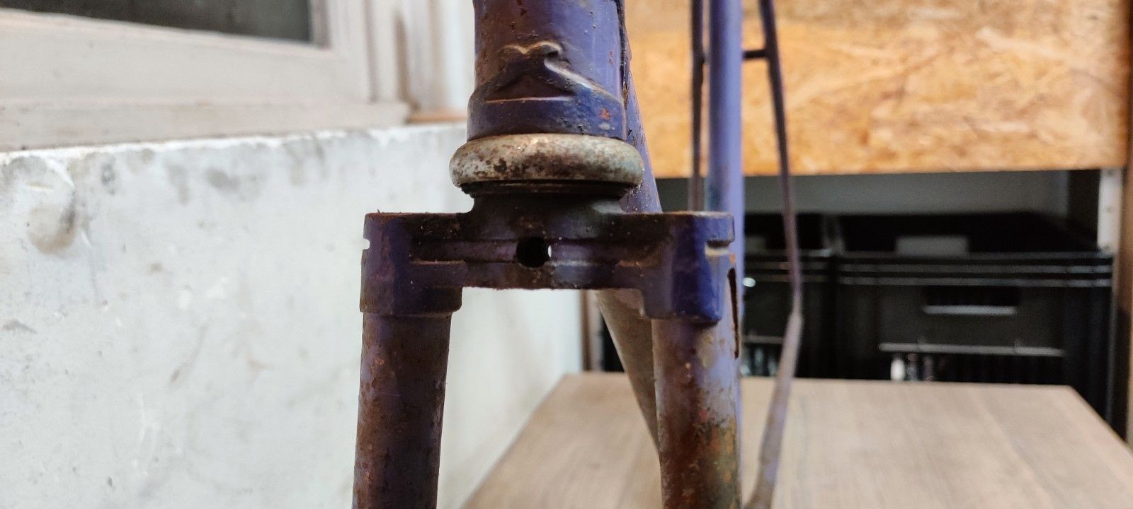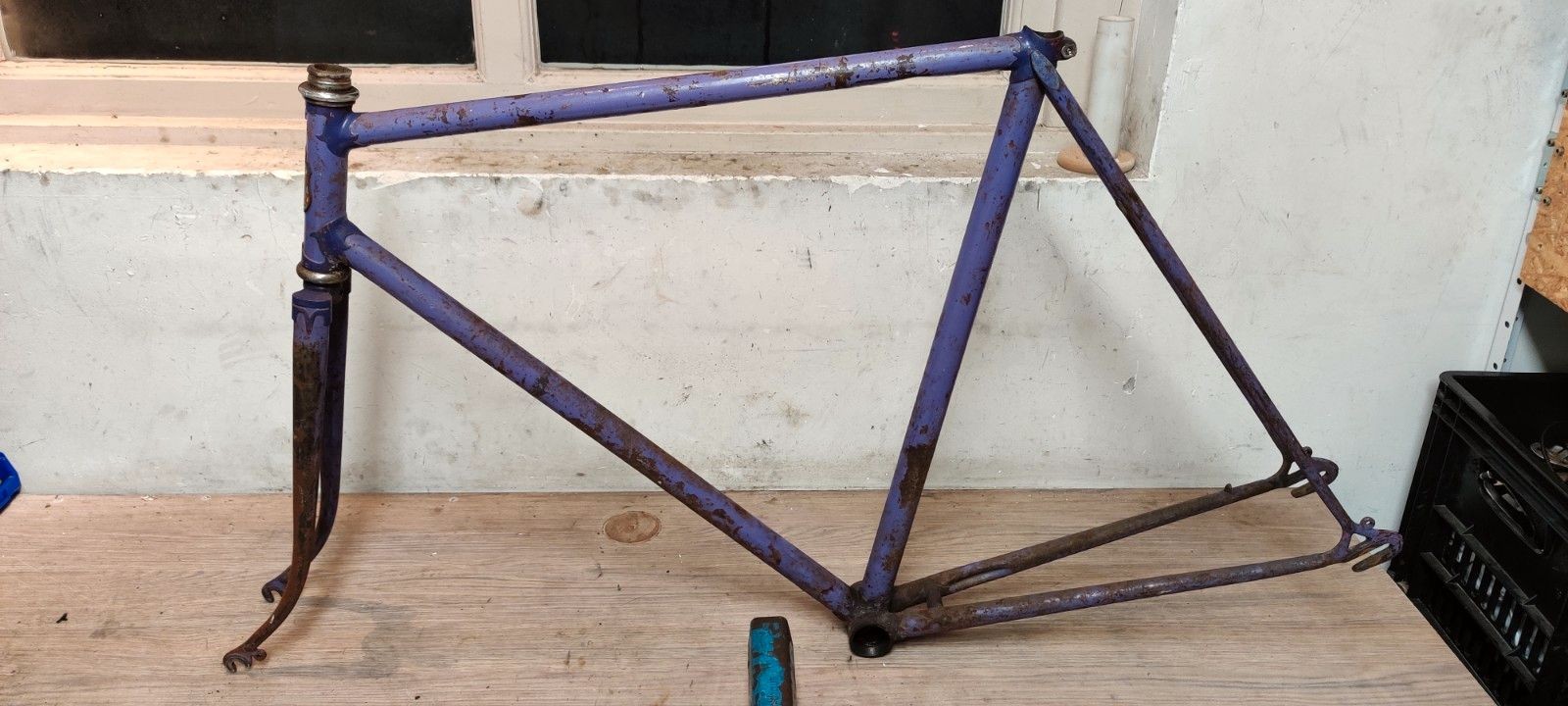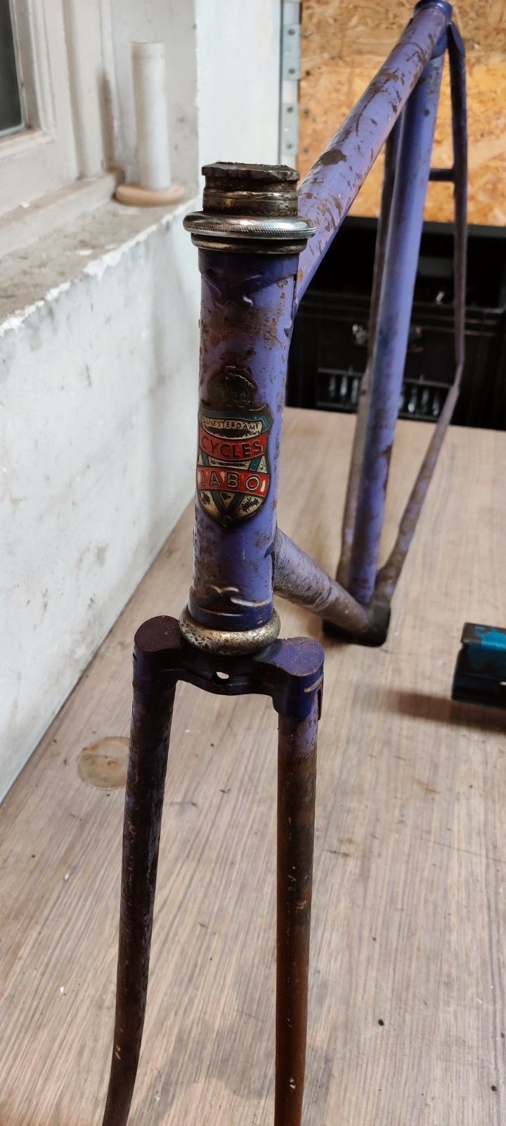 Ik kocht dit mooie Jabo frame. Het verkeert in behoorlijk erbarmelijke toestand, maar ik vind het wel een uitdaging het een nieuw leven te geven. Volgens de vorige eigenaar is het frame in deze toestand ooit in de jaren 70 in een container gevonden, waarna het al die jaren in een schuur heeft gelegen. Je kan je wel voorstellen waarom het is weggegooid destijds. Het derailleuroog is afgezaagd, haarscheur in de bracket en ook nog wat deukjes... Nu is het frame ondertussen zo oud dat het wel leuk is om toch de restauratie te beginnen.