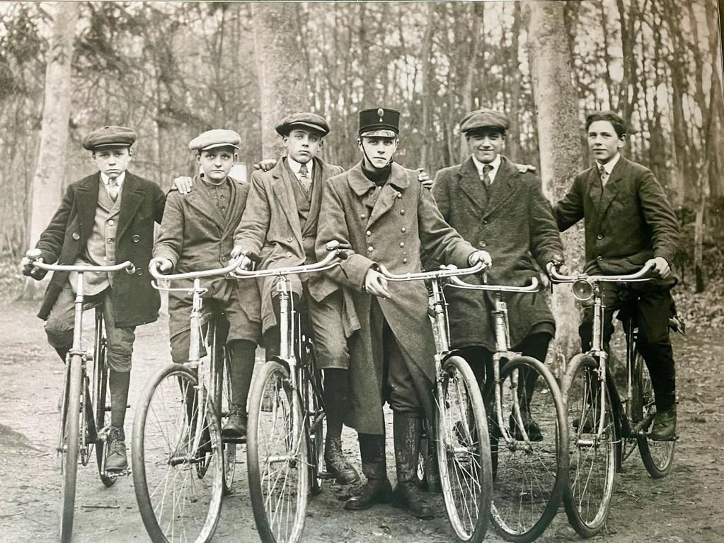 Het is tableau is duidelijk in scene gezet. In elk geval vier van de zes zijn te klein voor de fiets waar ze op zitten. Alleen de tweede van rechts maakt een volwassen indruk. Geen van de fietsen lijkt van Nederlandse makelij, ik zou eerder denken aan België of Frankrijk en qua periode aan de jaren 20. De rechtse fiets heeft trouwens een heel groot kettingwiel.