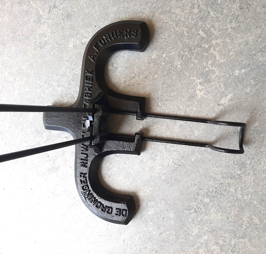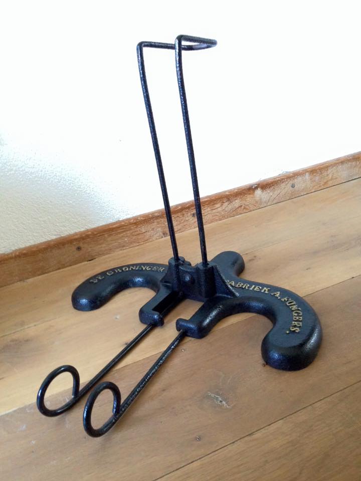 Onlangs kreeg ik (eindelijk) via Gerard een Fongers standaard van rond 1900 in handen. Hij stond op Marktplaats, had bij de eigenaar ca. 15 jaar in de tuin gestaan en was bijna bij het grof vuil beland. Het gietijzeren object van 5 kilo heb ik laten stralen, daarna gegrond met zinkfosfaat, zwart gespoten en de letters weer met goudverf tot leven gebracht. Bijgaand wat foto's.