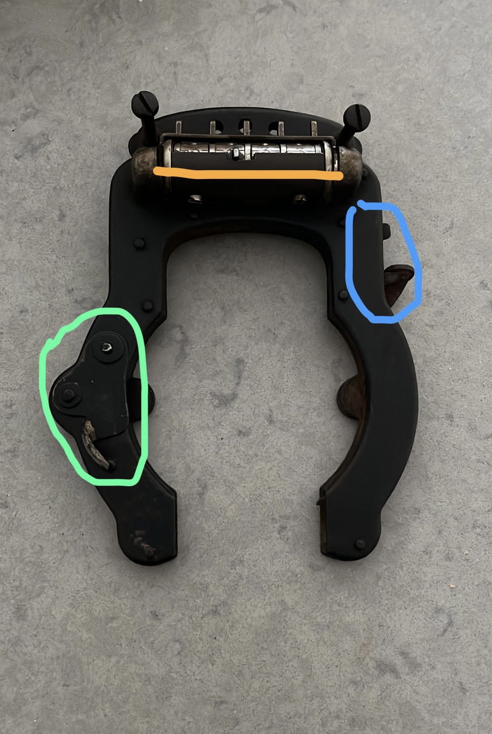 -van voren bezien dient het pinnetje rechts m.i. onder normale omstandigheden om de boog te vergrendelen in de open positie.