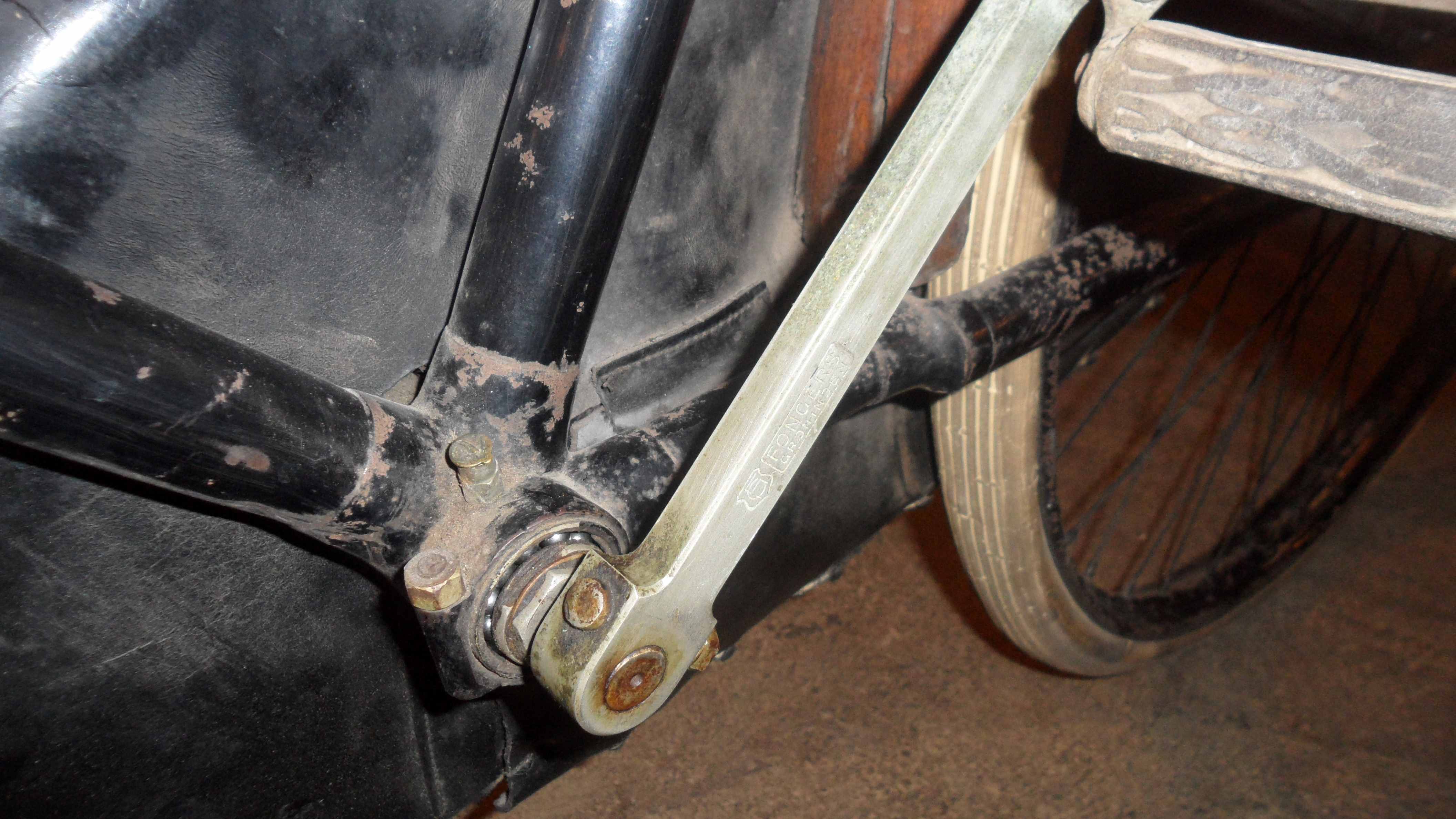 Of de bus is bij de 1900 Fongers een keer vervangen of de bus zit wat te ver in het frame. Dat laatste kan best omdat kettingkast beugels bij Fongers fietsen uit de vroege periode steeds in conflict komen met het tandblad en/of de drie platte schroeven van het tandblad.