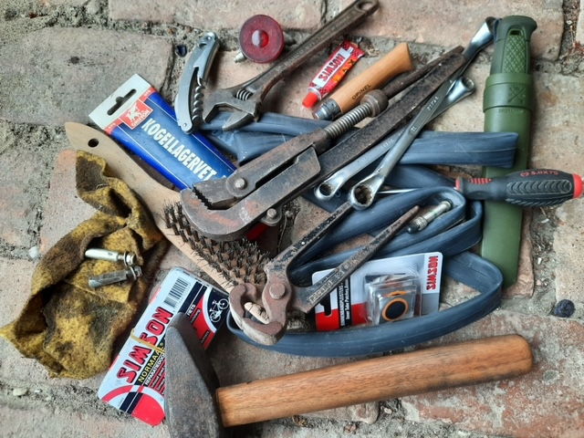 Heh, dat is meer gereedschap dan ik meeneem als ik met mijn bakfiets op pad gaat (daarmee loop je niet even mee aan de hand verder als er wat mis is). Of is dat om eventueel onderweg verworven tuinornamenten rijdend te maken?