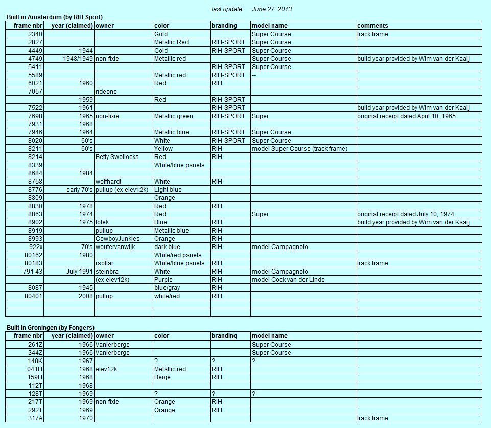 De eigen RiH Sport Super Course is van omstreeks 1965: Framenr 77 17. Afgemonteerd met Campagnolo Record en Mafac remmen Fiets is overigens nog te koop 8-)