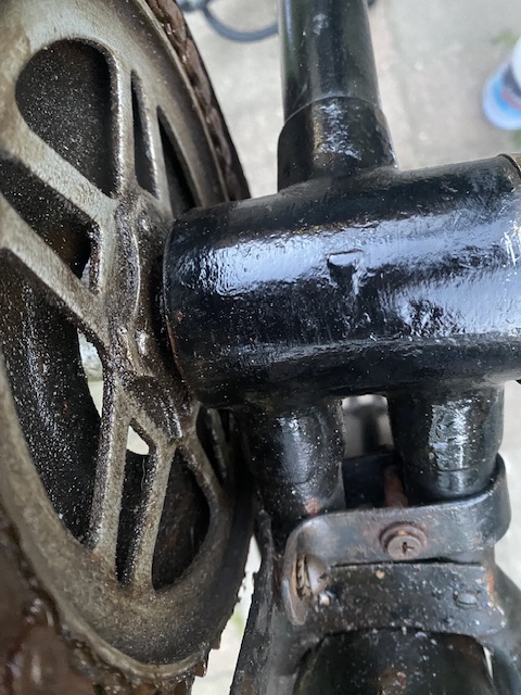Hierbij ook nog een foto van het tandwiel. Wat mij ook opvalt is dat er geen verbinding is tussen de achtervork poten (mannetje?) (wel een geschroefd plaatje. Het lijkt ook niet ooit verwijderd te zijn.