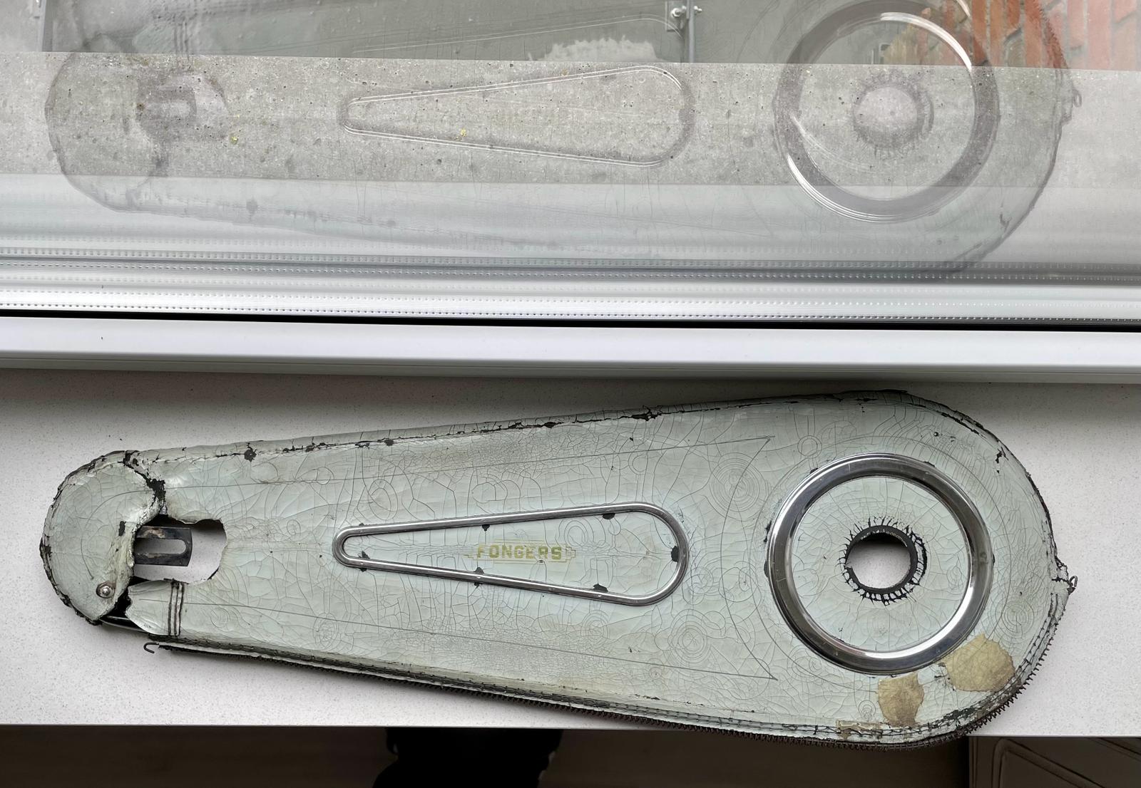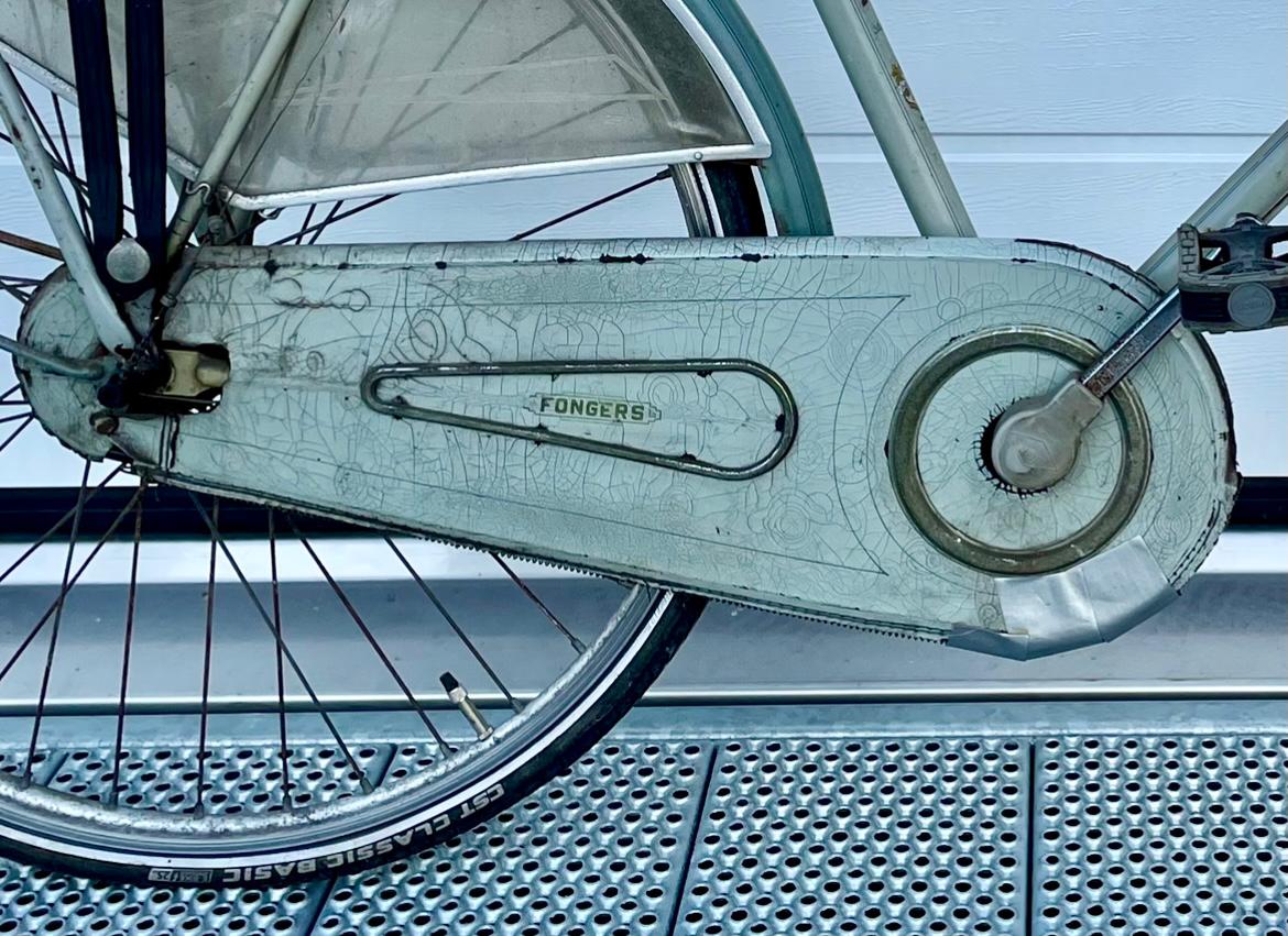 Één van de belangrijkste onderdelen bij het restaureren van een Fongers-fiets (in een bijzondere kleurstelling) uit de jaren '50 is toch wel het kettingkastlakdoek.
