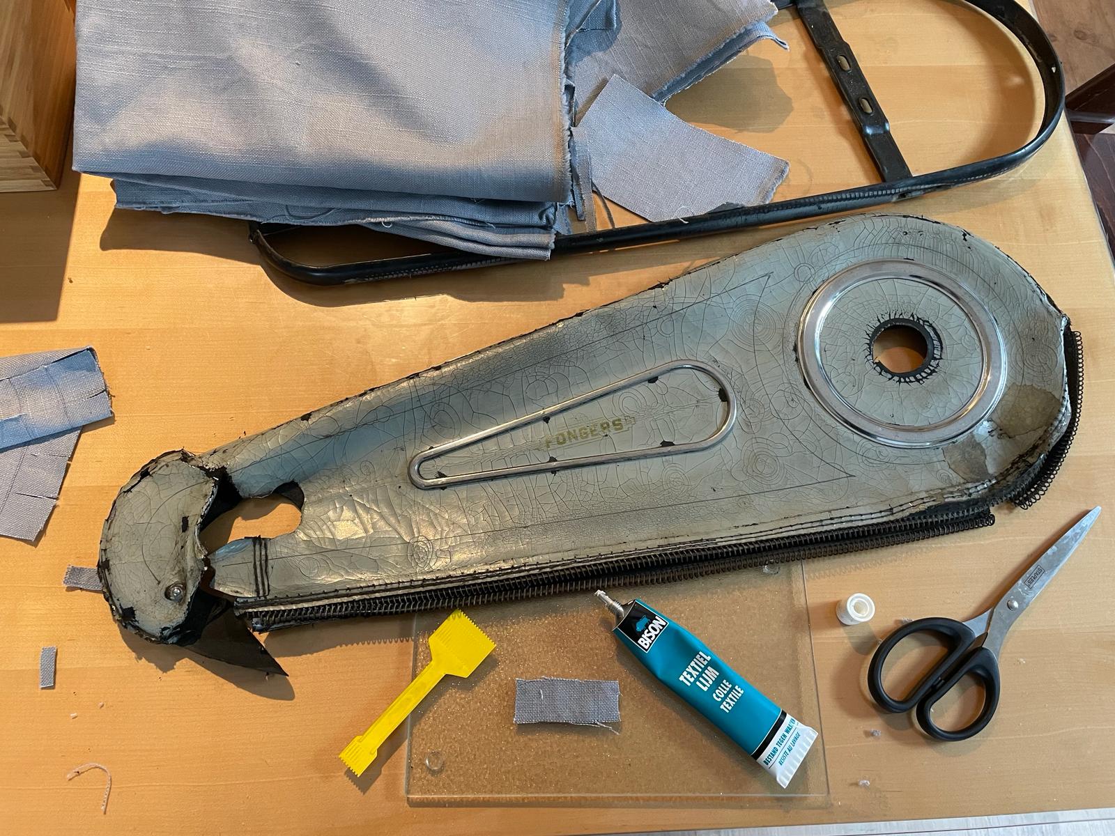 In eerste instantie heb ik het, zoals voorgeschreven in het restauratiedrieluik uit Het Rijwiel, geprobeerd met ducttape, maar dat plakte nauwelijks. Met textiellijm en een stevig stuk stof in enigszins dezelfde kleur is het uiteindelijk wel gelukt.