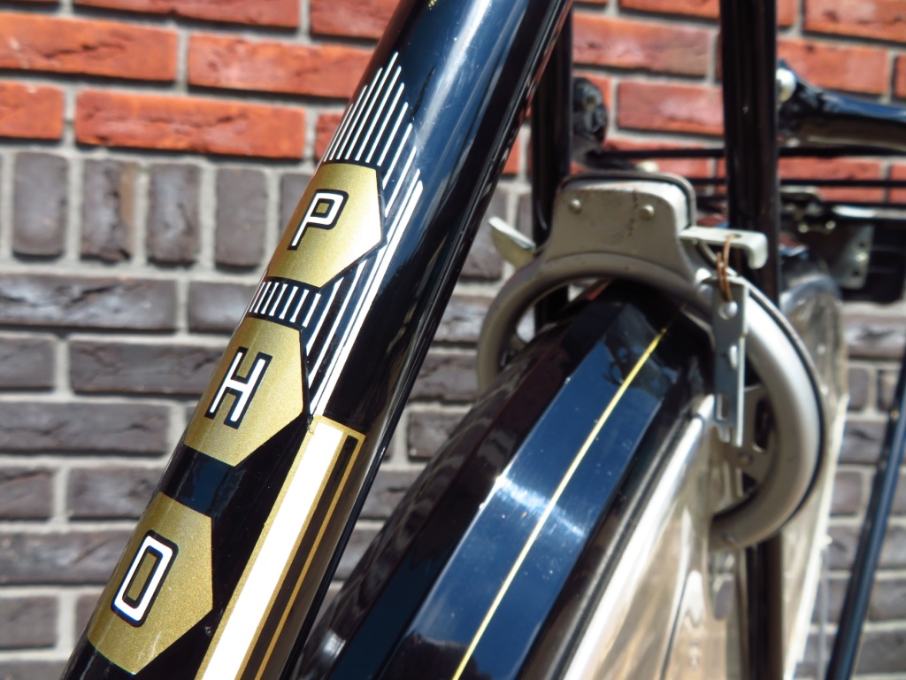 ik vind het een prachtige en vooral smaakvol uitgevoerde fiets. waar in die jaren veel werd geëxperimenteerd met (felle) kleuren(combinaties) en opvallende, soms schreeuwerige transfers, is deze phoenix wat dat betreft mooi uitgebalanceerd: traditioneel zwart (met bescheiden , doch mooie biezen en transfers) afgewisseld met lichte kleuraccenten (wit (op sierkettingkast, een tweekleurig (zwart/wit) lemet-zadel en witte ventieldopjes) en grijs (snelbinder, spatlap en stuurbeschermer).