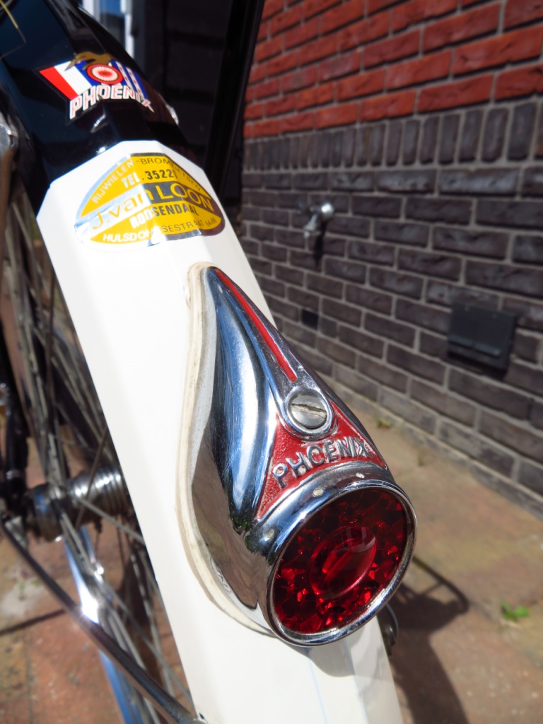 bedankt voor de complimenten mannen, al was dit van mijn kant natuurlijk een inkoppertje. soms heb je mazzel dat je tegen een pareltje aanloopt (die van jou is ook prachtig, ed!). in dit geval ook nog eens beginnersgeluk. de phoenix is mijn eerste ouwe, gekocht van de vader van een boedelopruimer uit heerhugowaard. in deze informatie zit ook de enige kritische kanttekening besloten: de aardige verkoper, die in tweedehands fietsen doet, had de voorband vervangen door een zwart tweedehandsje, omdat "de originele niet veel meer was." en de kettingkast had een deuk (in het sierframe en het doek), waarschijnlijk als gevolg van het vervoer (ik denk dat de fiets op een aanhanger is geknikkerd met een andere fiets erbovenop, die met de trapper in het doek heeft geprikt...).