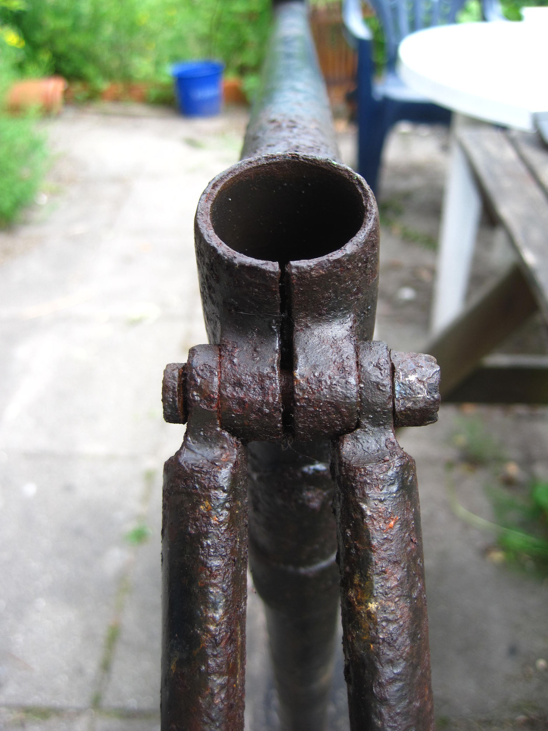 Het lijkt er dus sterk op dat mijn frame niet van een reguliere transportfiets is maar van een extra zwaar uitgevoerde legerfiets! Op de site van het nationaal militair museum staat een foto van zo’n fiets, uitgerust voor het vervoer en uitrollen van kabels. Een andere versie, uitgerust voor de allereerste versie van de mobiele telefoon staat op de site van museum waalsdorp, en op transporfiets.net. Het frame is exact hetzelfde, met de zelfde achtervork en aangesoldeerde pomphouders