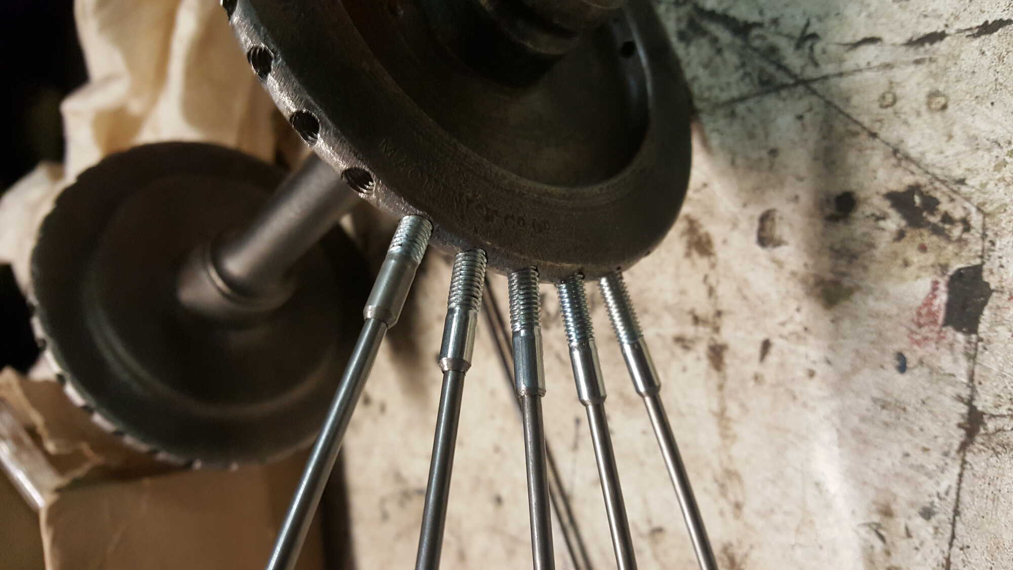 De vorige eigenaar heeft helaas de vastgelopen spaken met de slijptol uit de voor-naaf verwijderd, hierdoor ben ik zeer nauwkeurig de gaten gaan opvullen met koper-soldeer.