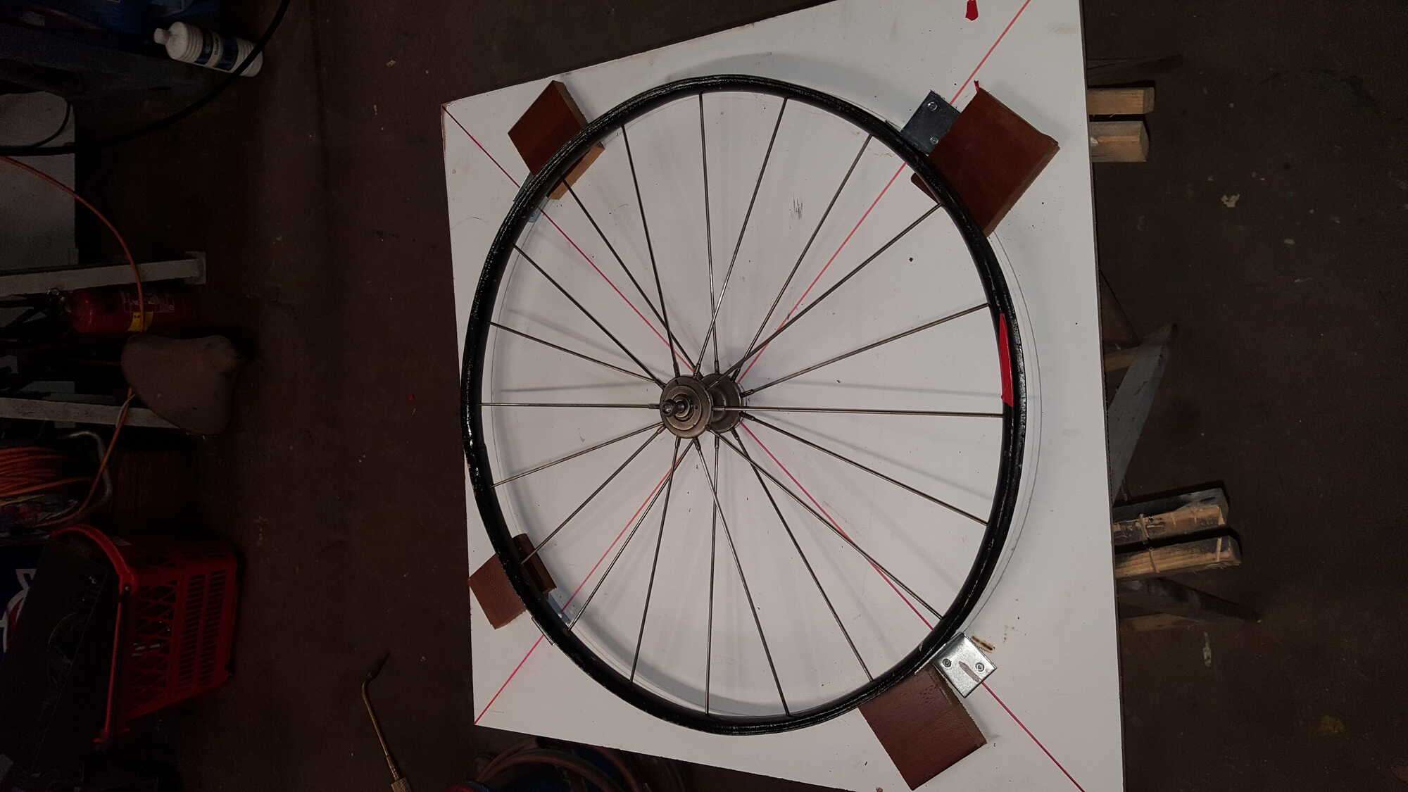 hierdoor heb ik met een passer de buitenmaat van de velg uitgetekend, en de velg doormiddel van houten blokken vast gepositioneerd.