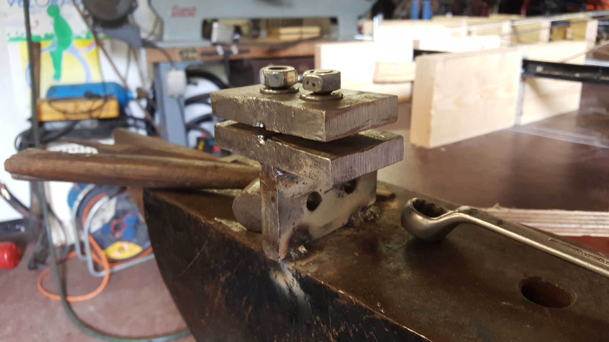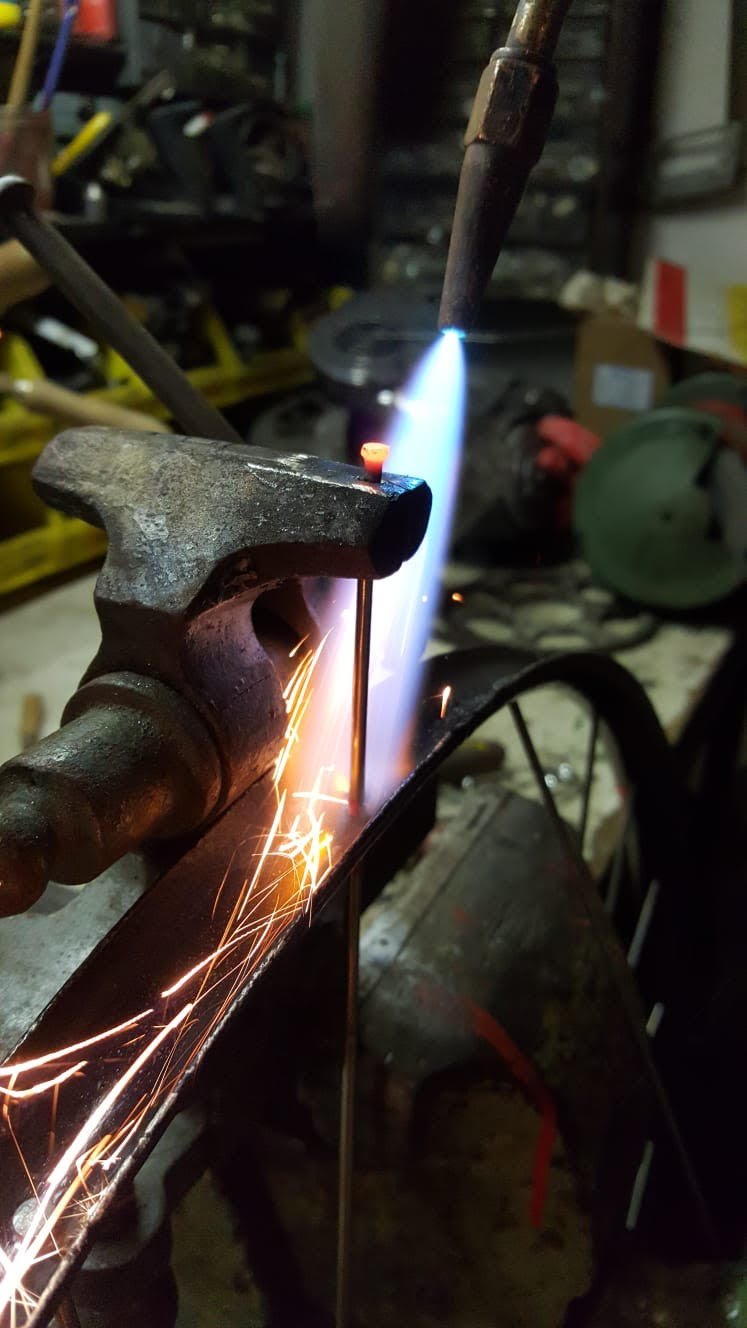 zo kon ik het balhoofd klemmen in de bankschroef en de poten na wat warmte torsen(richten) doormiddel van de pijp.