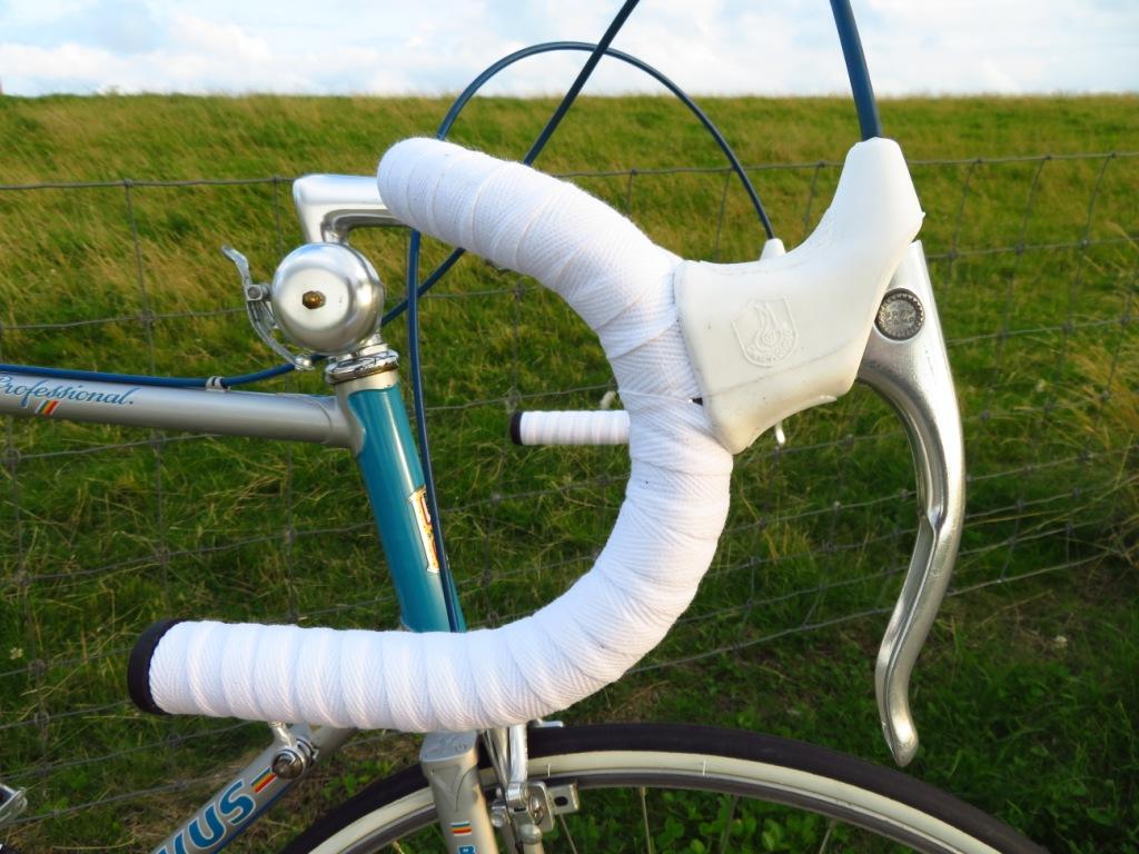 Qua staat van lak en onderdelen is dit eigenlijk de mooiste Professional die ik heb, ben er dan ook heel erg blij mee. Met droog weer maak ik er ritjes op, dus de gare originele bandjes heb ik wel moeten vervangen. Ook het cellotape-Benotto-stuurlint was gaar. Het blauwe San Marco Rolls zadel had ik nog liggen, er was een paar jaar geleden iemand die voor de hobby Rolls zadels naar wens opnieuw kon bekleden. Het Rolls zadel dat er op zat zit nu op een andere Professional..