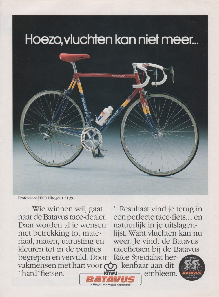 Mooie is dat een echte PR-strategie bij Batavus vaak leek te ontbreken. In 1990 was de Professional weer volledig gerestyled. Op een advertentie is echter te zien dat naast alle nieuwe gerestylede modellen deze teamkleur-Professional oude stijl ook nog gewoon te bestellen was :lol:
