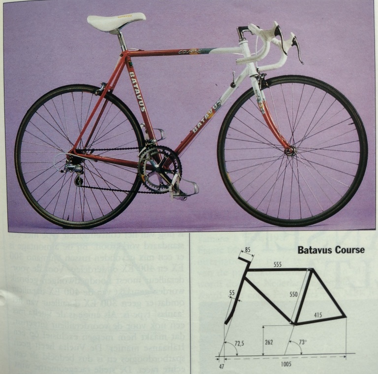 Nee inderdaad, ook in de Professional-folder die Batavus op aanvraag verstrekte staat niks over geometrie. In oude edities van Fiets werd dat net zoals nu wel altijd uitgezocht, maar ik heb nog geen uitgave met een Professional gevonden... Hieronder wel de Course, van latere datum; mei 1990.