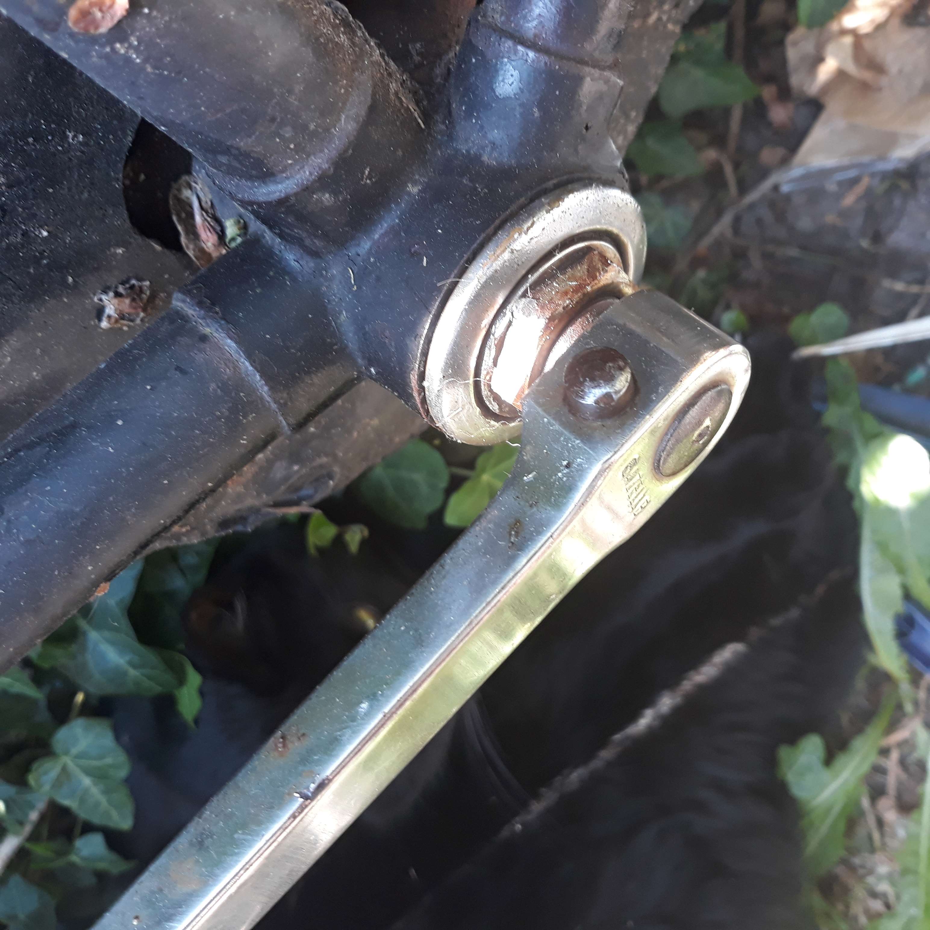 Ik gebruiik eigenlijk geen facebook meer, maar mischien kun je de foto hier plaatsen. Hierbij een foto van een Thompson as zoals in een Gazelle 1 of in dit geval een model Dienst gemonteerd werden. Je ziet hier een borgmoer en daarachter de stofkap met cup die allemaal met de trapas meedraaien. Waarom de foto gespiegeld is weet ik ook niet.
