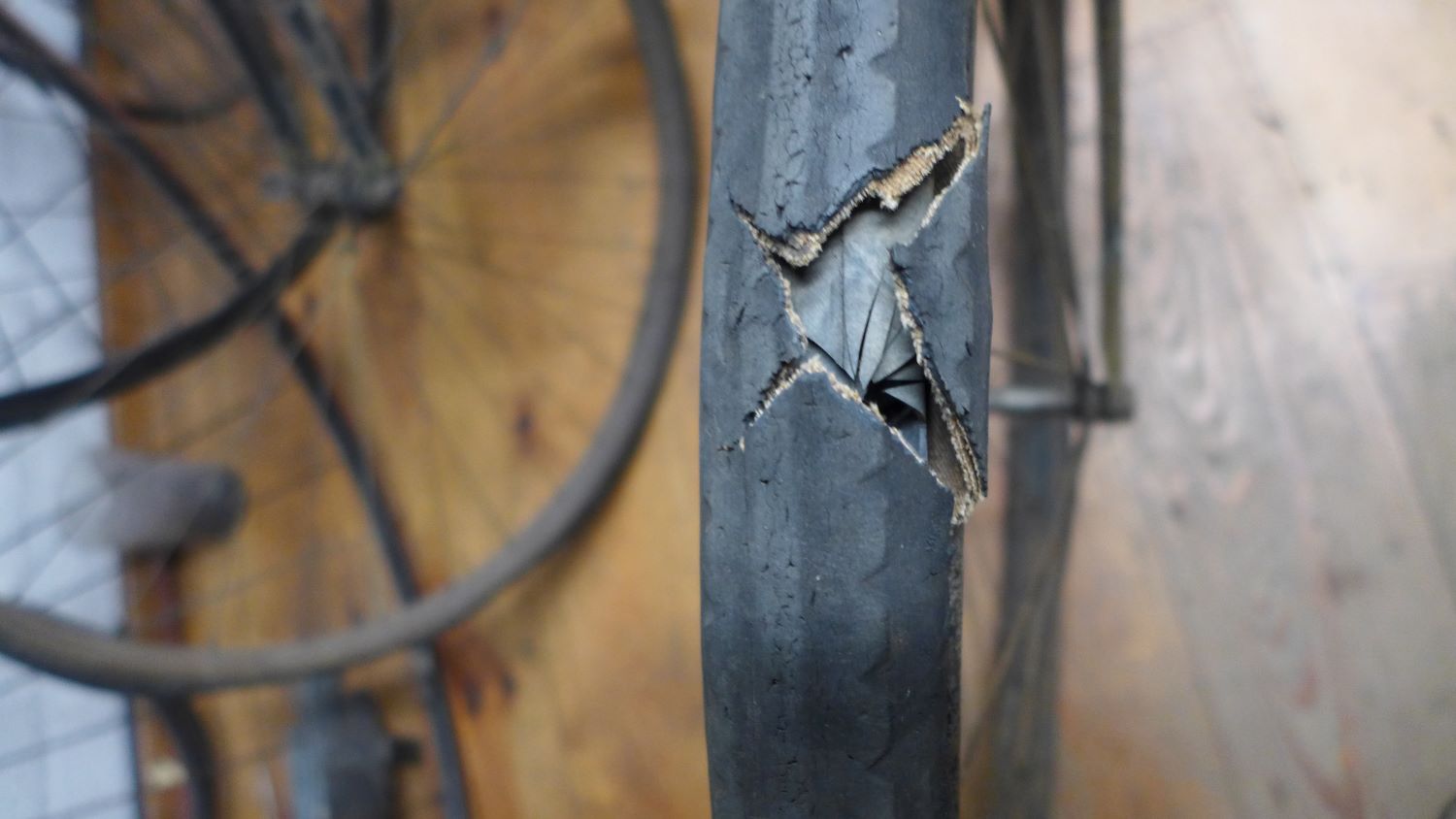 Het canvas bleek te zeer vergaan om de druk van de binnenband te kunnen weerstaan.