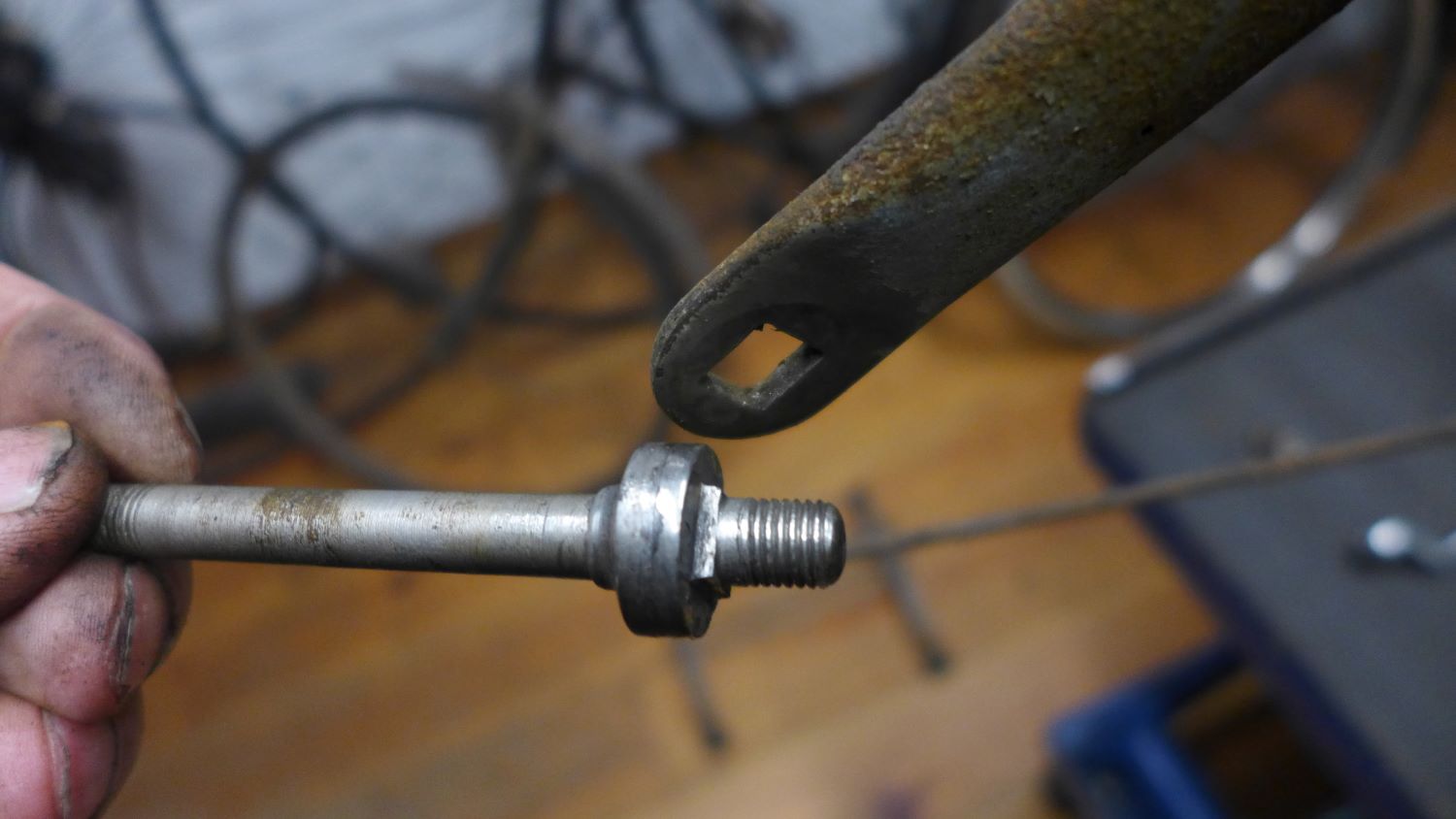 Van de trapas was de schroefdraad ( gewoon rechtse draad) totaal uitgelopen aan een kant. de conus kon je er gewoon uitpakken zonder te hoeven draaien. Spiebaan totaal weg aan die kant en cranks die te ruim waren en niet origineel.
