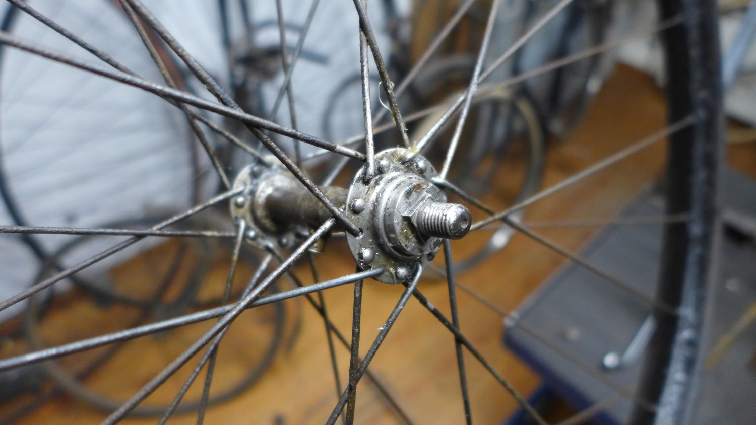 Voor de cranks heb ik een van de twee behouden en een andere crank er bij gezocht. Beide kanten nu met rechtse draad en aan gesoldeerde klemschoefjes. Ook de crankspie gaten moesten verhuizen en er zit een bus in het trapasgat om van 15,8 naar 14,8 mm te gaan.