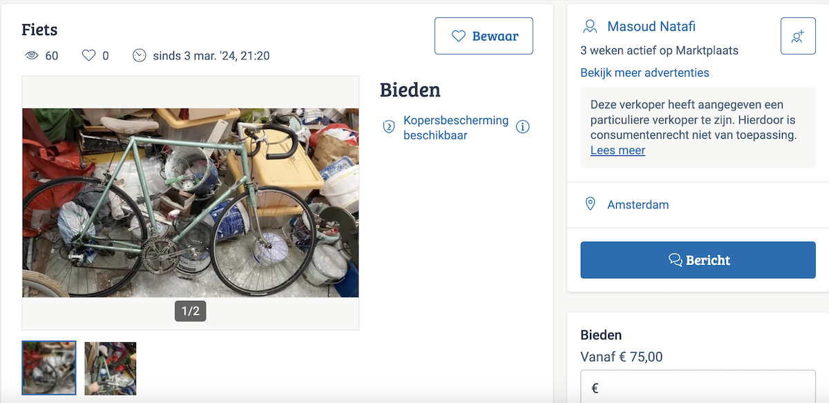 Voor een fiets van dit kaliber die op het eerste gezicht niet veel meer nodig heeft dan wat vet, lucht en liefde lijkt me €75 zeker niet teveel. Als het mijn maat was (en ik er bovendien niet al een had) zou de verleiding best groot geweest zijn.