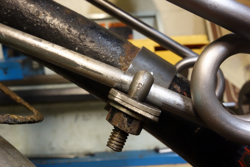 De constructie is wat vreemd om eerlijk te zijn. aan de vork zit een enkele kogel met daaromheen een afstelbare kom uit twee delen .Een spie met aan beide zijden een moer zorgt voor de afstelling. Omdat het een kogelgewricht is kan de arm behalve op en neer met de pedaalslag ook wat naar buiten en binnen draaien. Mij lijkt dat overbodig omdat bij een nette rechte pedaalas en crank de totale arm in één verticaal vlak beweegt en de kogelconstructie alleen bijdraagt tot een beweegbaarheid in een richting die je liever niet wil...