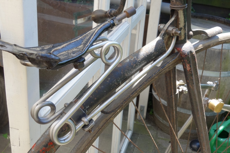 Op veel fietsen als extra aangeboden maar op de Singer xtra vanaf plm 1884 bijna een standaard uitvoering. De fiets van Velorama (plm 1885-86) heeft nog een bladveer maar dat is relatief zeldzaam.