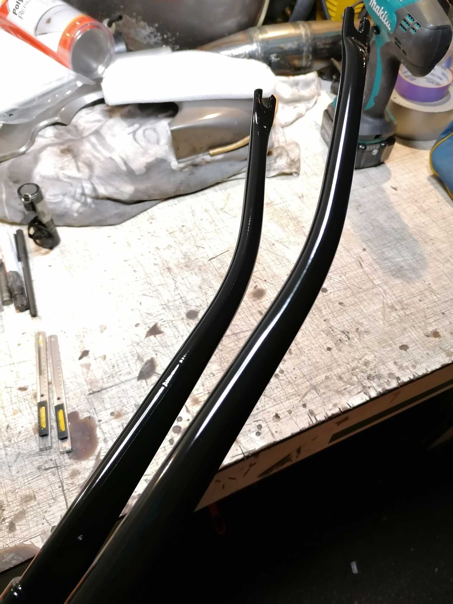 Komende week ga ik alles nog een keer nameten en dan spaken bestellen. De aluminium velgen staan prachtig te blinken in de hoek, de belgom aluminiumpoets is een aanrader. Daarnaast heeft de voorvork vandaag een nieuw laagje verf gekregen. Enige wat daar aan moet gebeuren is het snijden van verse draad, deze is namelijk beschadigd. Wel mooi om te zien dat deze ook gemerkt is met een kleine "J".