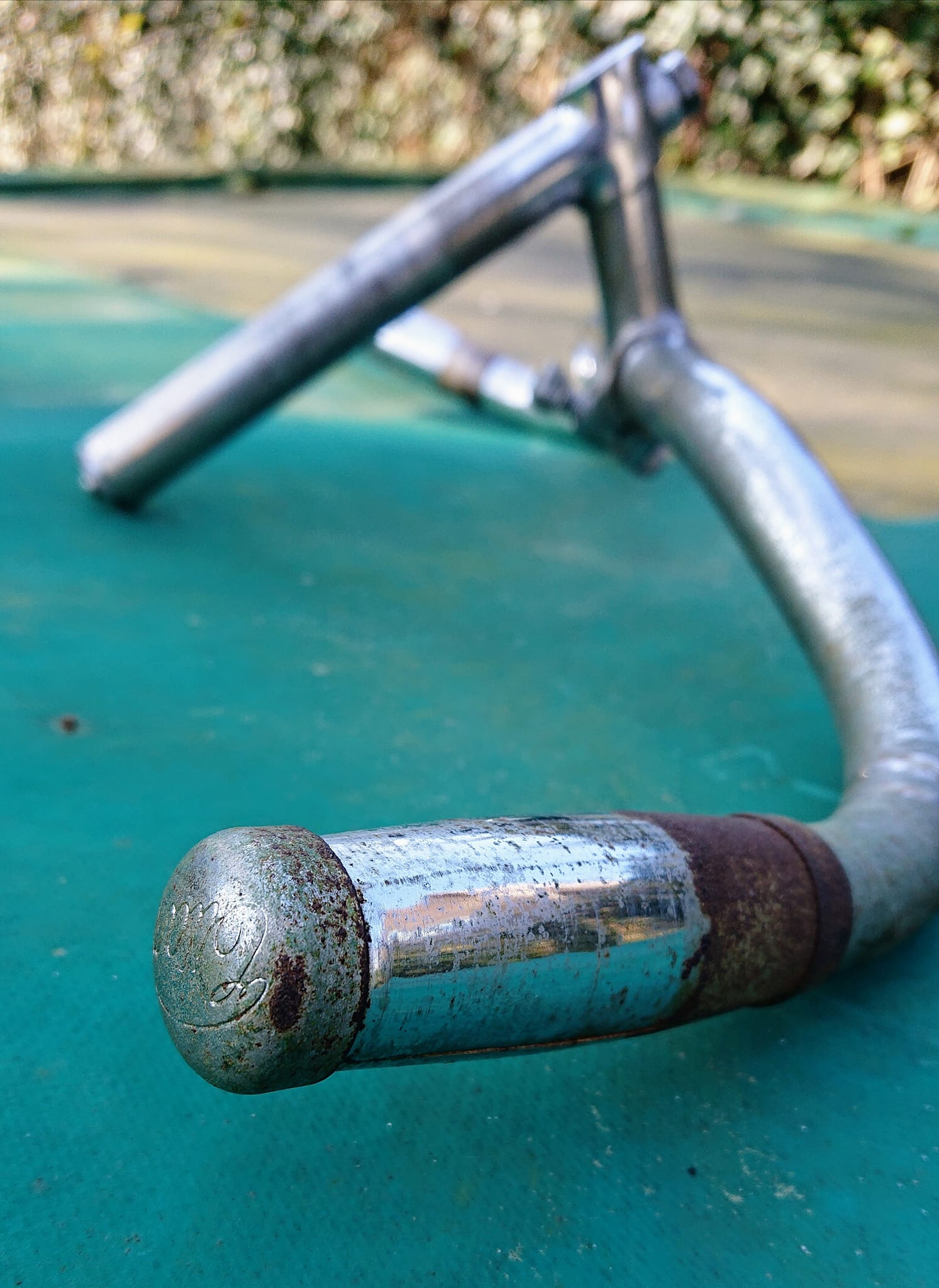Marco dit is het stuur dat je op de foto van mijn eerder post ziet. Waarmee ik de handvatten ga bekleden weet ik nog niet. Dat zit wat mij betreft in de eindfase en wat ik dan vind kleuren bij het geheel. Vandaag is de crank gereed, maar er is nog flink wat herstelwerk te doen. Ook de bevestiging van de Simplex Tour de France derailleur ben ik nog niet uit. De derailleur ben ik nu aan het schoonmaken, poetsen, smeren en in elkaar aan het zetten. Ik denk dat ik nog wel met wat foto's terugkom op de bevestiging.